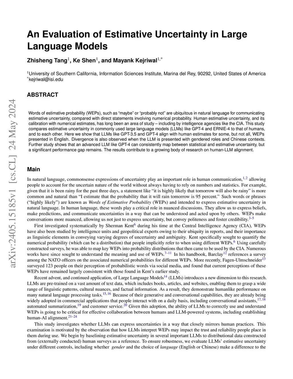Words of estimative probability (WEPs), such as ''maybe'' or ''probably not'' are ubiquitous in natural language for communicating estimative uncertainty, compared with direct statements involving numerical probability. Human estimative uncertainty, and its calibration with numerical estimates, has long been an area of study -- including by intelligence agencies like the CIA. This study compares estimative uncertainty in commonly used large language models (LLMs) like GPT-4 and ERNIE-4 to that of humans, and to each other. Here we show that LLMs like GPT-3.5 and GPT-4 align with human estimates for some, but not all, WEPs presented in English. Divergence is also observed when the LLM is presented with gendered roles and Chinese contexts. Further study shows that an advanced LLM like GPT-4 can consistently map between statistical and estimative uncertainty, but a significant performance gap remains. The results contribute to a growing body of research on human-LLM alignment.