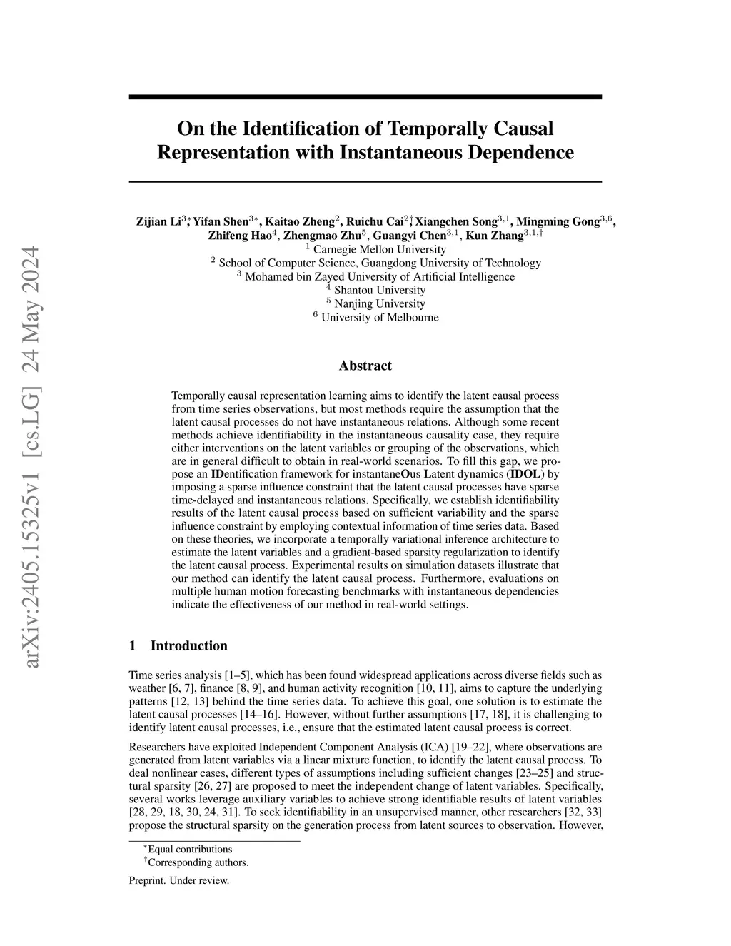 Temporally causal representation learning aims to identify the latent causal process from time series observations, but most methods require the assumption that the latent causal processes do not have instantaneous relations. Although some recent methods achieve identifiability in the instantaneous causality case, they require either interventions on the latent variables or grouping of the observations, which are in general difficult to obtain in real-world scenarios. To fill this gap, we propose an \textbf{ID}entification framework for instantane\textbf{O}us \textbf{L}atent dynamics (\textbf{IDOL}) by imposing a sparse influence constraint that the latent causal processes have sparse time-delayed and instantaneous relations. Specifically, we establish identifiability results of the latent causal process based on sufficient variability and the sparse influence constraint by employing contextual information of time series data. Based on these theories, we incorporate a temporally variational inference architecture to estimate the latent variables and a gradient-based sparsity regularization to identify the latent causal process. Experimental results on simulation datasets illustrate that our method can identify the latent causal process. Furthermore, evaluations on multiple human motion forecasting benchmarks with instantaneous dependencies indicate the effectiveness of our method in real-world settings.