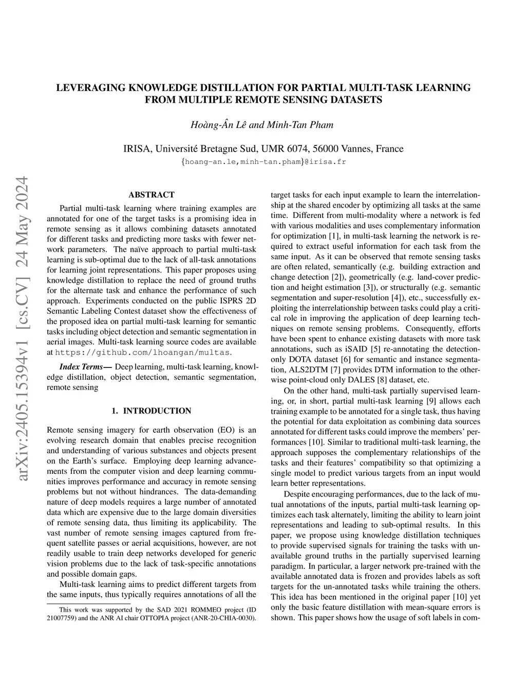 Partial multi-task learning where training examples are annotated for one of the target tasks is a promising idea in remote sensing as it allows combining datasets annotated for different tasks and predicting more tasks with fewer network parameters. The na\"ive approach to partial multi-task learning is sub-optimal due to the lack of all-task annotations for learning joint representations. This paper proposes using knowledge distillation to replace the need of ground truths for the alternate task and enhance the performance of such approach. Experiments conducted on the public ISPRS 2D Semantic Labeling Contest dataset show the effectiveness of the proposed idea on partial multi-task learning for semantic tasks including object detection and semantic segmentation in aerial images.