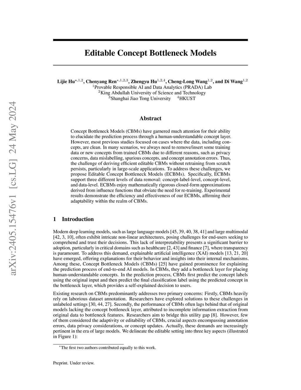 Concept Bottleneck Models (CBMs) have garnered much attention for their ability to elucidate the prediction process through a humanunderstandable concept layer. However, most previous studies focused on cases where the data, including concepts, are clean. In many scenarios, we often need to remove/insert some training data or new concepts from trained CBMs for reasons such as privacy concerns, data mislabelling, spurious concepts, and concept annotation errors. Thus, deriving efficient editable CBMs without retraining from scratch remains a challenge, particularly in large-scale applications. To address these challenges, we propose Editable Concept Bottleneck Models (ECBMs). Specifically, ECBMs support three different levels of data removal: concept-label-level, concept-level, and data-level. ECBMs enjoy mathematically rigorous closed-form approximations derived from influence functions that obviate the need for retraining. Experimental results demonstrate the efficiency and adaptability of our ECBMs, affirming their practical value in CBMs.
