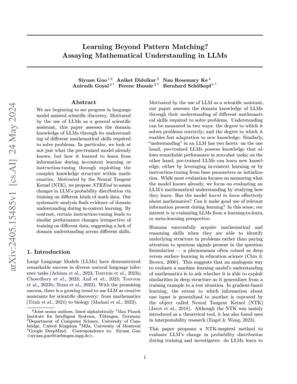We are beginning to see progress in language model assisted scientific discovery. Motivated by the use of LLMs as a general scientific assistant, this paper assesses the domain knowledge of LLMs through its understanding of different mathematical skills required to solve problems. In particular, we look at not just what the pre-trained model already knows, but how it learned to learn from information during in-context learning or instruction-tuning through exploiting the complex knowledge structure within mathematics. Motivated by the Neural Tangent Kernel (NTK), we propose \textit{NTKEval} to assess changes in LLM's probability distribution via training on different kinds of math data. Our systematic analysis finds evidence of domain understanding during in-context learning. By contrast, certain instruction-tuning leads to similar performance changes irrespective of training on different data, suggesting a lack of domain understanding across different skills.