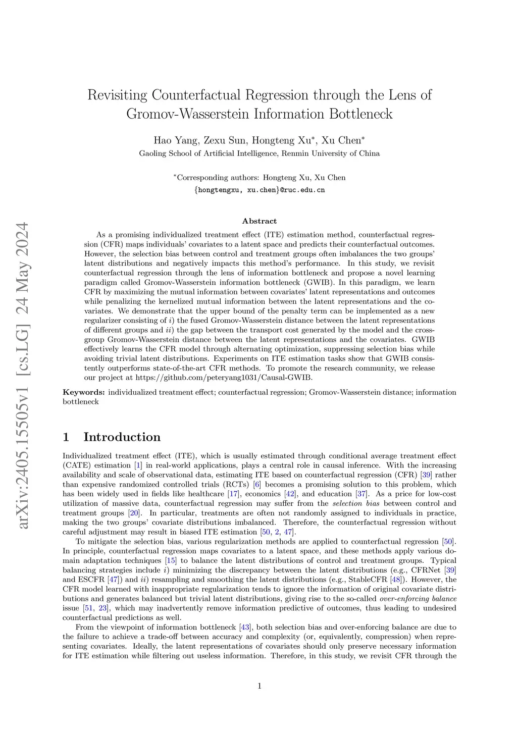 As a promising individualized treatment effect (ITE) estimation method, counterfactual regression (CFR) maps individuals' covariates to a latent space and predicts their counterfactual outcomes. However, the selection bias between control and treatment groups often imbalances the two groups' latent distributions and negatively impacts this method's performance. In this study, we revisit counterfactual regression through the lens of information bottleneck and propose a novel learning paradigm called Gromov-Wasserstein information bottleneck (GWIB). In this paradigm, we learn CFR by maximizing the mutual information between covariates' latent representations and outcomes while penalizing the kernelized mutual information between the latent representations and the covariates. We demonstrate that the upper bound of the penalty term can be implemented as a new regularizer consisting of the fused Gromov-Wasserstein distance between the latent representations of different groups and the gap between the transport cost generated by the model and the cross-group Gromov-Wasserstein distance between the latent representations and the covariates. GWIB effectively learns the CFR model through alternating optimization, suppressing selection bias while avoiding trivial latent distributions. Experiments on ITE estimation tasks show that GWIB consistently outperforms state-of-the-art CFR methods. To promote the research community, we release our project at https://github.com/peteryang1031/Causal-GWIB.