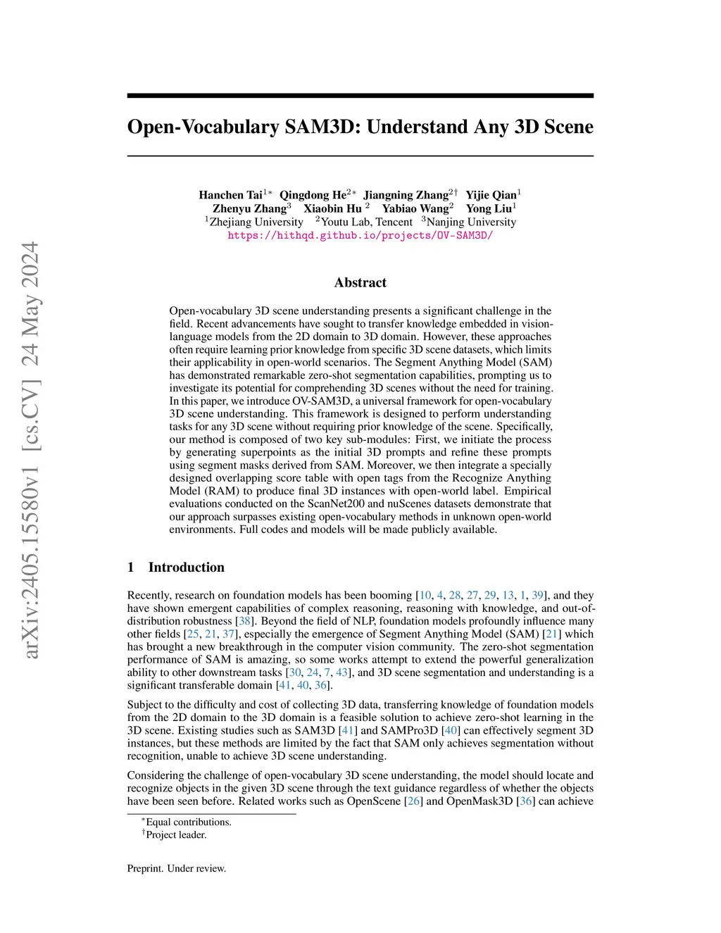 Open-vocabulary 3D scene understanding presents a significant challenge in the field. Recent advancements have sought to transfer knowledge embedded in vision language models from the 2D domain to 3D domain. However, these approaches often require learning prior knowledge from specific 3D scene datasets, which limits their applicability in open-world scenarios. The Segment Anything Model (SAM) has demonstrated remarkable zero-shot segmentation capabilities, prompting us to investigate its potential for comprehending 3D scenes without the need for training. In this paper, we introduce OV-SAM3D, a universal framework for open-vocabulary 3D scene understanding. This framework is designed to perform understanding tasks for any 3D scene without requiring prior knowledge of the scene. Specifically, our method is composed of two key sub-modules: First, we initiate the process by generating superpoints as the initial 3D prompts and refine these prompts using segment masks derived from SAM. Moreover, we then integrate a specially designed overlapping score table with open tags from the Recognize Anything Model (RAM) to produce final 3D instances with open-world label. Empirical evaluations conducted on the ScanNet200 and nuScenes datasets demonstrate that our approach surpasses existing open-vocabulary methods in unknown open-world environments.