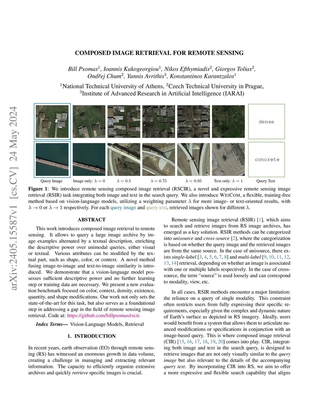 This work introduces composed image retrieval to remote sensing. It allows to query a large image archive by image examples alternated by a textual description, enriching the descriptive power over unimodal queries, either visual or textual. Various attributes can be modified by the textual part, such as shape, color, or context. A novel method fusing image-to-image and text-to-image similarity is introduced. We demonstrate that a vision-language model possesses sufficient descriptive power and no further learning step or training data are necessary. We present a new evaluation benchmark focused on color, context, density, existence, quantity, and shape modifications. Our work not only sets the state-of-the-art for this task, but also serves as a foundational step in addressing a gap in the field of remote sensing image retrieval. Code at: https://github.com/billpsomas/rscir