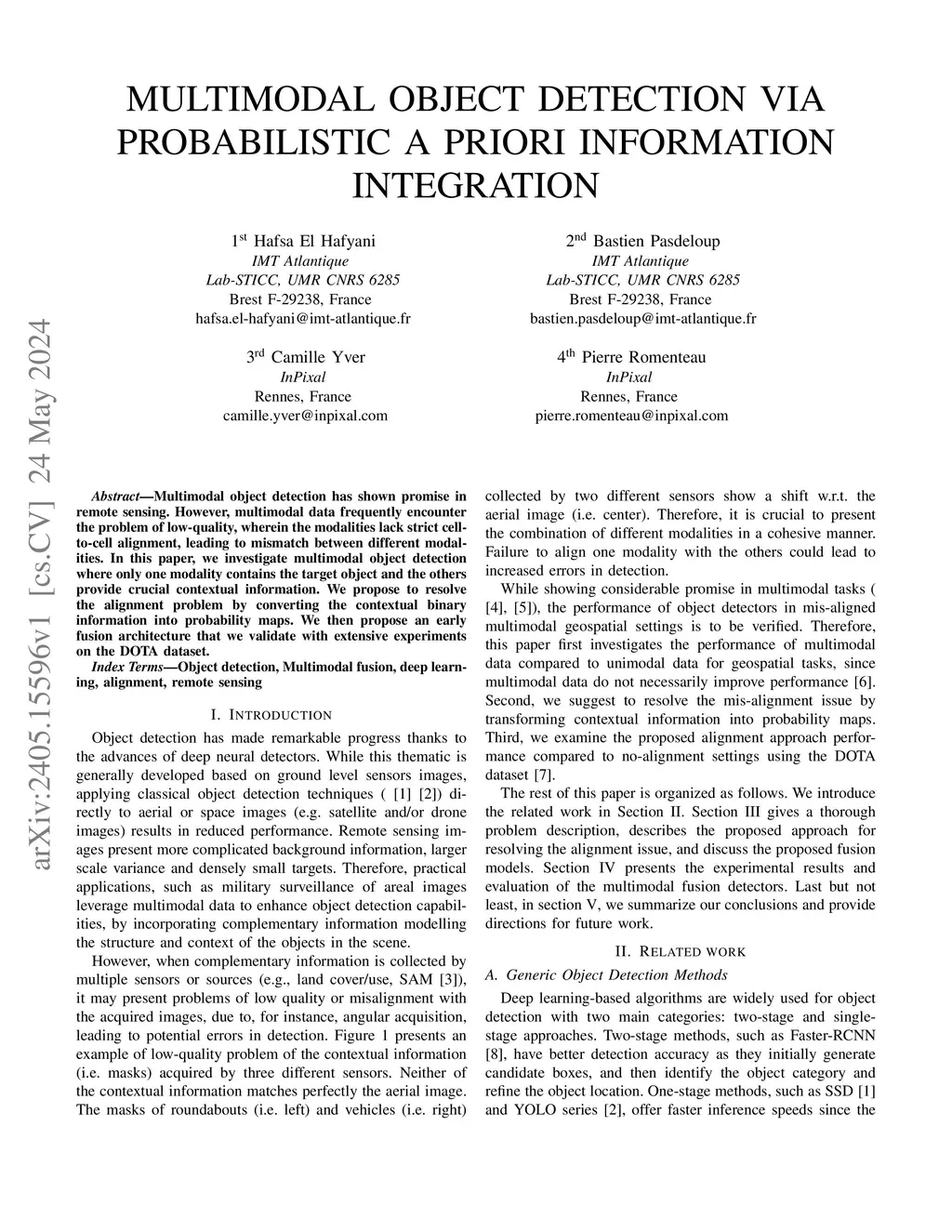 Multimodal object detection has shown promise in remote sensing. However, multimodal data frequently encounter the problem of low-quality, wherein the modalities lack strict cell-to-cell alignment, leading to mismatch between different modalities. In this paper, we investigate multimodal object detection where only one modality contains the target object and the others provide crucial contextual information. We propose to resolve the alignment problem by converting the contextual binary information into probability maps. We then propose an early fusion architecture that we validate with extensive experiments on the DOTA dataset.