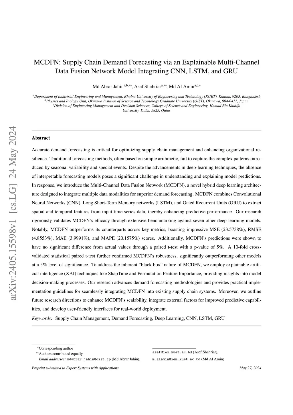 Accurate demand forecasting is crucial for optimizing supply chain management. Traditional methods often fail to capture complex patterns from seasonal variability and special events. Despite advancements in deep learning, interpretable forecasting models remain a challenge. To address this, we introduce the Multi-Channel Data Fusion Network (MCDFN), a hybrid architecture that integrates Convolutional Neural Networks (CNN), Long Short-Term Memory networks (LSTM), and Gated Recurrent Units (GRU) to enhance predictive performance by extracting spatial and temporal features from time series data. Our comparative benchmarking demonstrates that MCDFN outperforms seven other deep-learning models, achieving superior metrics: MSE (23.5738), RMSE (4.8553), MAE (3.9991), and MAPE (20.1575%). Theil's U statistic of 0.1181 (U<1) of MCDFN indicates its superiority over the naive forecasting approach, and a 10-fold cross-validated statistical paired t-test with a p-value of 5% indicated no significant difference between MCDFN's predictions and actual values. We apply explainable AI techniques like ShapTime and Permutation Feature Importance to enhance interpretability. This research advances demand forecasting methodologies and offers practical guidelines for integrating MCDFN into supply chain systems, highlighting future research directions for scalability and user-friendly deployment.