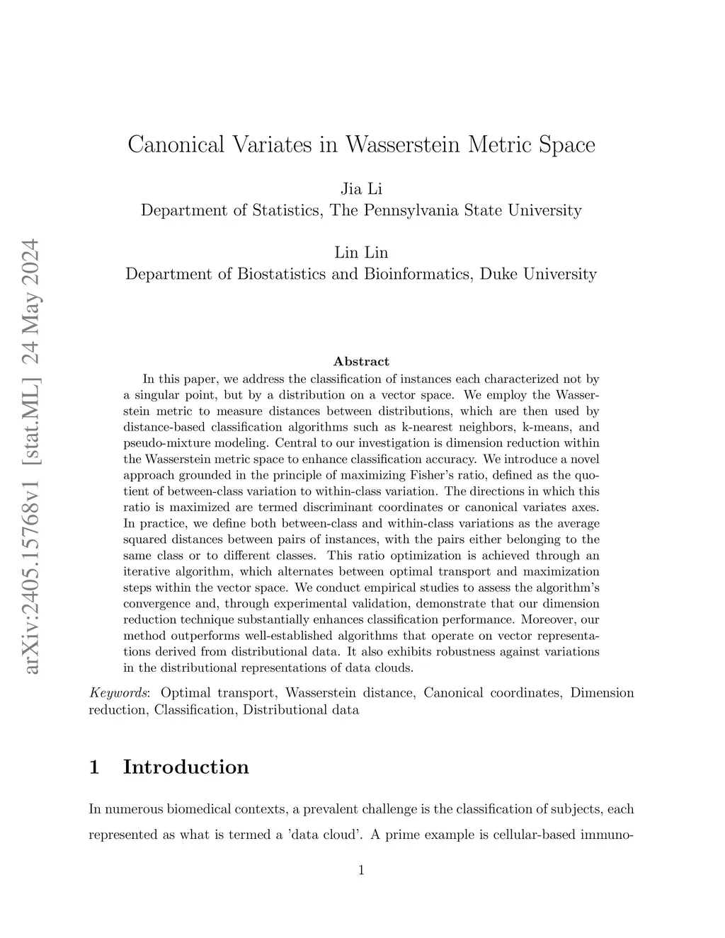 In this paper, we address the classification of instances each characterized not by a singular point, but by a distribution on a vector space. We employ the Wasserstein metric to measure distances between distributions, which are then used by distance-based classification algorithms such as k-nearest neighbors, k-means, and pseudo-mixture modeling. Central to our investigation is dimension reduction within the Wasserstein metric space to enhance classification accuracy. We introduce a novel approach grounded in the principle of maximizing Fisher's ratio, defined as the quotient of between-class variation to within-class variation. The directions in which this ratio is maximized are termed discriminant coordinates or canonical variates axes. In practice, we define both between-class and within-class variations as the average squared distances between pairs of instances, with the pairs either belonging to the same class or to different classes. This ratio optimization is achieved through an iterative algorithm, which alternates between optimal transport and maximization steps within the vector space. We conduct empirical studies to assess the algorithm's convergence and, through experimental validation, demonstrate that our dimension reduction technique substantially enhances classification performance. Moreover, our method outperforms well-established algorithms that operate on vector representations derived from distributional data. It also exhibits robustness against variations in the distributional representations of data clouds.