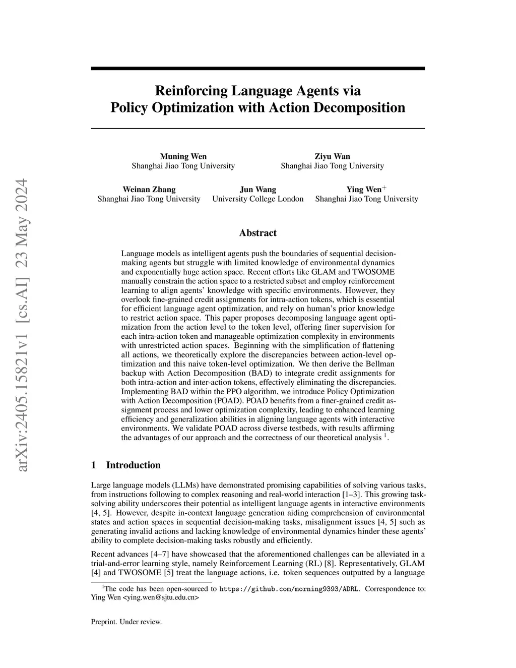 Language models as intelligent agents push the boundaries of sequential decision-making agents but struggle with limited knowledge of environmental dynamics and exponentially huge action space. Recent efforts like GLAM and TWOSOME manually constrain the action space to a restricted subset and employ reinforcement learning to align agents' knowledge with specific environments. However, they overlook fine-grained credit assignments for intra-action tokens, which is essential for efficient language agent optimization, and rely on human's prior knowledge to restrict action space. This paper proposes decomposing language agent optimization from the action level to the token level, offering finer supervision for each intra-action token and manageable optimization complexity in environments with unrestricted action spaces. Beginning with the simplification of flattening all actions, we theoretically explore the discrepancies between action-level optimization and this naive token-level optimization. We then derive the Bellman backup with Action Decomposition (BAD) to integrate credit assignments for both intra-action and inter-action tokens, effectively eliminating the discrepancies. Implementing BAD within the PPO algorithm, we introduce Policy Optimization with Action Decomposition (POAD). POAD benefits from a finer-grained credit assignment process and lower optimization complexity, leading to enhanced learning efficiency and generalization abilities in aligning language agents with interactive environments. We validate POAD across diverse testbeds, with results affirming the advantages of our approach and the correctness of our theoretical analysis.