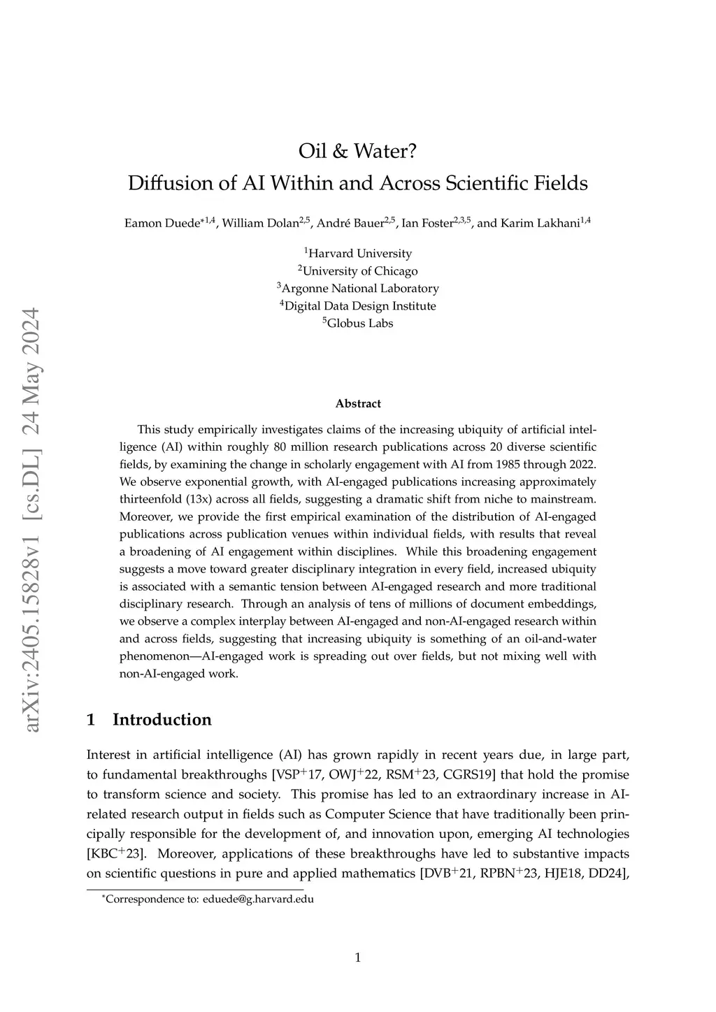 This study empirically investigates claims of the increasing ubiquity of artificial intelligence (AI) within roughly 80 million research publications across 20 diverse scientific fields, by examining the change in scholarly engagement with AI from 1985 through 2022. We observe exponential growth, with AI-engaged publications increasing approximately thirteenfold (13x) across all fields, suggesting a dramatic shift from niche to mainstream. Moreover, we provide the first empirical examination of the distribution of AI-engaged publications across publication venues within individual fields, with results that reveal a broadening of AI engagement within disciplines. While this broadening engagement suggests a move toward greater disciplinary integration in every field, increased ubiquity is associated with a semantic tension between AI-engaged research and more traditional disciplinary research. Through an analysis of tens of millions of document embeddings, we observe a complex interplay between AI-engaged and non-AI-engaged research within and across fields, suggesting that increasing ubiquity is something of an oil-and-water phenomenon -- AI-engaged work is spreading out over fields, but not mixing well with non-AI-engaged work.