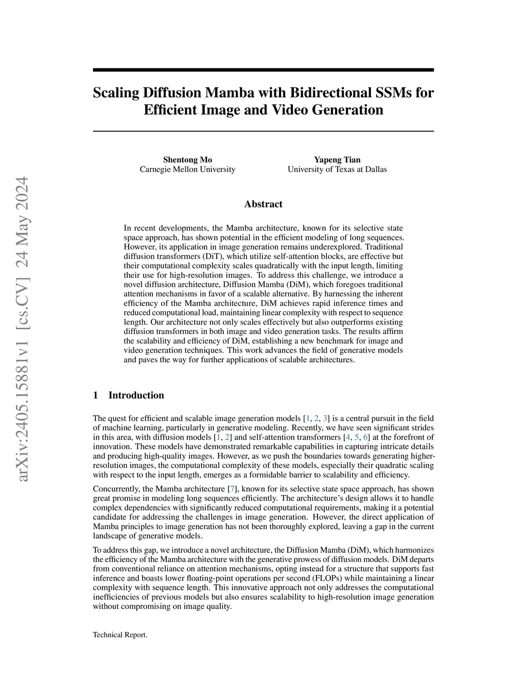 In recent developments, the Mamba architecture, known for its selective state space approach, has shown potential in the efficient modeling of long sequences. However, its application in image generation remains underexplored. Traditional diffusion transformers (DiT), which utilize self-attention blocks, are effective but their computational complexity scales quadratically with the input length, limiting their use for high-resolution images. To address this challenge, we introduce a novel diffusion architecture, Diffusion Mamba (DiM), which foregoes traditional attention mechanisms in favor of a scalable alternative. By harnessing the inherent efficiency of the Mamba architecture, DiM achieves rapid inference times and reduced computational load, maintaining linear complexity with respect to sequence length. Our architecture not only scales effectively but also outperforms existing diffusion transformers in both image and video generation tasks. The results affirm the scalability and efficiency of DiM, establishing a new benchmark for image and video generation techniques. This work advances the field of generative models and paves the way for further applications of scalable architectures.