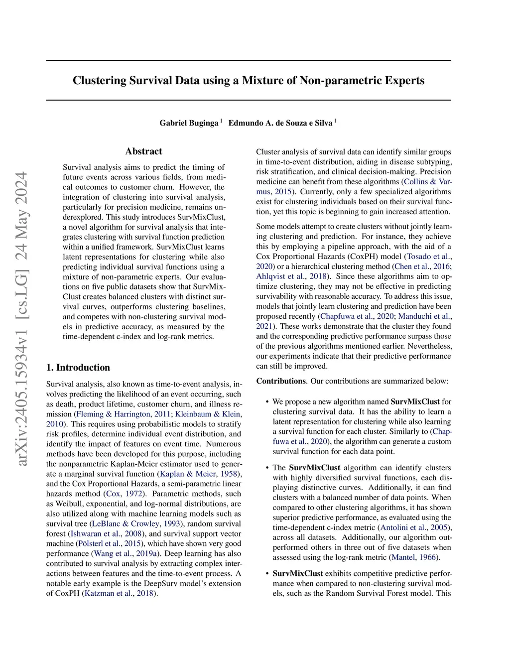 Survival analysis aims to predict the timing of future events across various fields, from medical outcomes to customer churn. However, the integration of clustering into survival analysis, particularly for precision medicine, remains underexplored. This study introduces SurvMixClust, a novel algorithm for survival analysis that integrates clustering with survival function prediction within a unified framework. SurvMixClust learns latent representations for clustering while also predicting individual survival functions using a mixture of non-parametric experts. Our evaluations on five public datasets show that SurvMixClust creates balanced clusters with distinct survival curves, outperforms clustering baselines, and competes with non-clustering survival models in predictive accuracy, as measured by the time-dependent c-index and log-rank metrics.