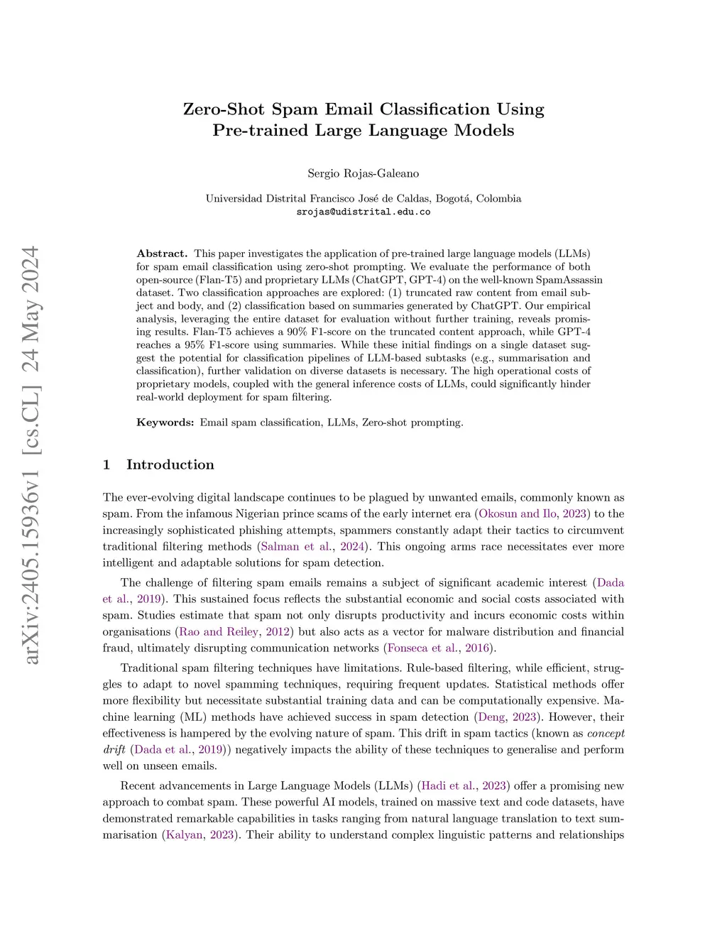 This paper investigates the application of pre-trained large language models (LLMs) for spam email classification using zero-shot prompting. We evaluate the performance of both open-source (Flan-T5) and proprietary LLMs (ChatGPT, GPT-4) on the well-known SpamAssassin dataset. Two classification approaches are explored: (1) truncated raw content from email subject and body, and (2) classification based on summaries generated by ChatGPT. Our empirical analysis, leveraging the entire dataset for evaluation without further training, reveals promising results. Flan-T5 achieves a 90% F1-score on the truncated content approach, while GPT-4 reaches a 95% F1-score using summaries. While these initial findings on a single dataset suggest the potential for classification pipelines of LLM-based subtasks (e.g., summarisation and classification), further validation on diverse datasets is necessary. The high operational costs of proprietary models, coupled with the general inference costs of LLMs, could significantly hinder real-world deployment for spam filtering.