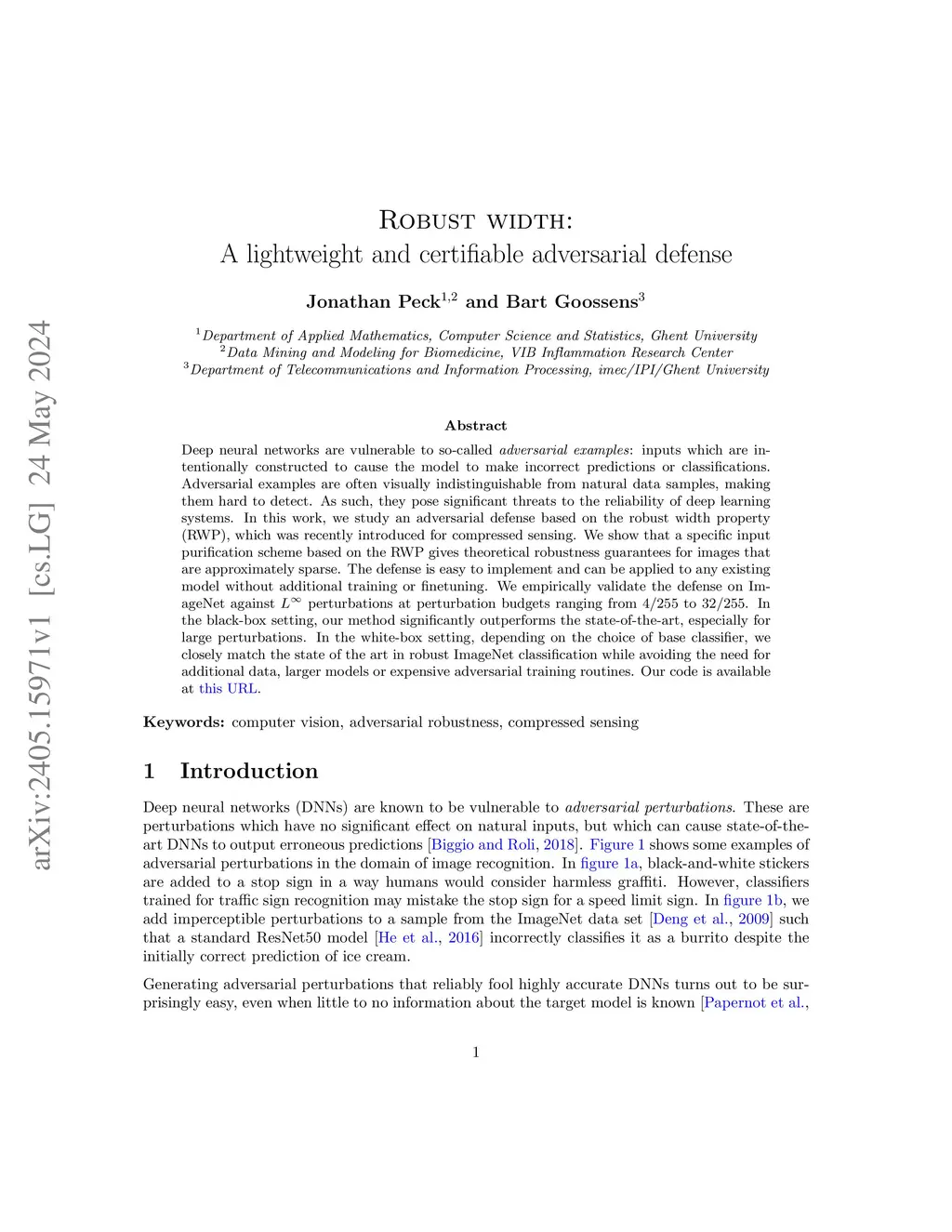 Deep neural networks are vulnerable to so-called adversarial examples: inputs which are intentionally constructed to cause the model to make incorrect predictions or classifications. Adversarial examples are often visually indistinguishable from natural data samples, making them hard to detect. As such, they pose significant threats to the reliability of deep learning systems. In this work, we study an adversarial defense based on the robust width property (RWP), which was recently introduced for compressed sensing. We show that a specific input purification scheme based on the RWP gives theoretical robustness guarantees for images that are approximately sparse. The defense is easy to implement and can be applied to any existing model without additional training or finetuning. We empirically validate the defense on ImageNet against perturbations at perturbation budgets ranging from to . In the black-box setting, our method significantly outperforms the state-of-the-art, especially for large perturbations. In the white-box setting, depending on the choice of base classifier, we closely match the state of the art in robust ImageNet classification while avoiding the need for additional data, larger models or expensive adversarial training routines. Our code is available at https://github.com/peck94/robust-width-defense.