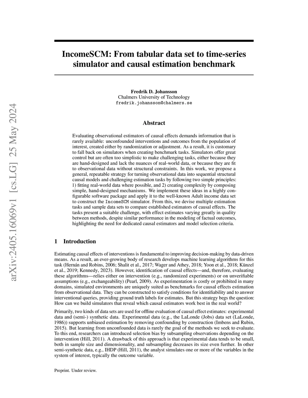 Evaluating observational estimators of causal effects demands information that is rarely available: unconfounded interventions and outcomes from the population of interest, created either by randomization or adjustment. As a result, it is customary to fall back on simulators when creating benchmark tasks. Simulators offer great control but are often too simplistic to make challenging tasks, either because they are hand-designed and lack the nuances of real-world data, or because they are fit to observational data without structural constraints. In this work, we propose a general, repeatable strategy for turning observational data into sequential structural causal models and challenging estimation tasks by following two simple principles: 1) fitting real-world data where possible, and 2) creating complexity by composing simple, hand-designed mechanisms. We implement these ideas in a highly configurable software package and apply it to the well-known Adult income data set to construct the \tt IncomeSCM simulator. From this, we devise multiple estimation tasks and sample data sets to compare established estimators of causal effects. The tasks present a suitable challenge, with effect estimates varying greatly in quality between methods, despite similar performance in the modeling of factual outcomes, highlighting the need for dedicated causal estimators and model selection criteria.