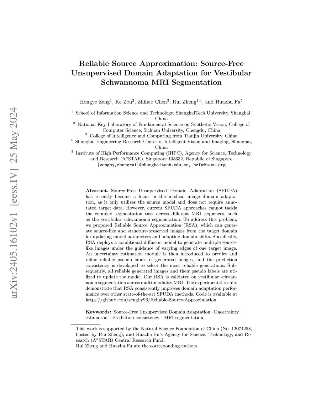 Source-Free Unsupervised Domain Adaptation (SFUDA) has recently become a focus in the medical image domain adaptation, as it only utilizes the source model and does not require annotated target data. However, current SFUDA approaches cannot tackle the complex segmentation task across different MRI sequences, such as the vestibular schwannoma segmentation. To address this problem, we proposed Reliable Source Approximation (RSA), which can generate source-like and structure-preserved images from the target domain for updating model parameters and adapting domain shifts. Specifically, RSA deploys a conditional diffusion model to generate multiple source-like images under the guidance of varying edges of one target image. An uncertainty estimation module is then introduced to predict and refine reliable pseudo labels of generated images, and the prediction consistency is developed to select the most reliable generations. Subsequently, all reliable generated images and their pseudo labels are utilized to update the model. Our RSA is validated on vestibular schwannoma segmentation across multi-modality MRI. The experimental results demonstrate that RSA consistently improves domain adaptation performance over other state-of-the-art SFUDA methods. Code is available at https://github.com/zenghy96/Reliable-Source-Approximation.