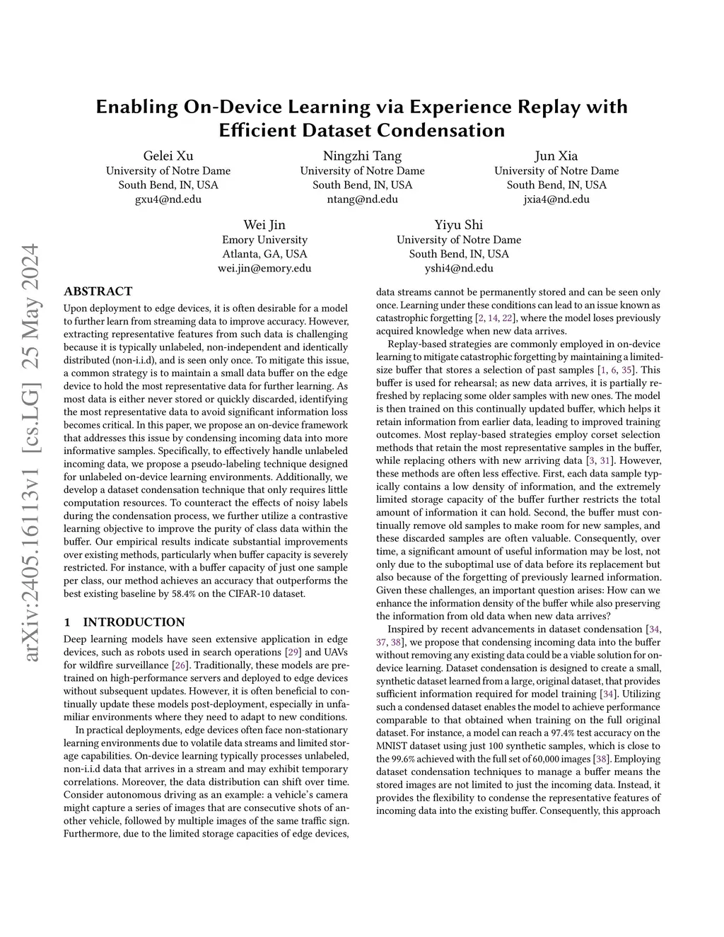 Upon deployment to edge devices, it is often desirable for a model to further learn from streaming data to improve accuracy. However, extracting representative features from such data is challenging because it is typically unlabeled, non-independent and identically distributed (non-i.i.d), and is seen only once. To mitigate this issue, a common strategy is to maintain a small data buffer on the edge device to hold the most representative data for further learning. As most data is either never stored or quickly discarded, identifying the most representative data to avoid significant information loss becomes critical. In this paper, we propose an on-device framework that addresses this issue by condensing incoming data into more informative samples. Specifically, to effectively handle unlabeled incoming data, we propose a pseudo-labeling technique designed for unlabeled on-device learning environments. Additionally, we develop a dataset condensation technique that only requires little computation resources. To counteract the effects of noisy labels during the condensation process, we further utilize a contrastive learning objective to improve the purity of class data within the buffer. Our empirical results indicate substantial improvements over existing methods, particularly when buffer capacity is severely restricted. For instance, with a buffer capacity of just one sample per class, our method achieves an accuracy that outperforms the best existing baseline by 58.4% on the CIFAR-10 dataset.