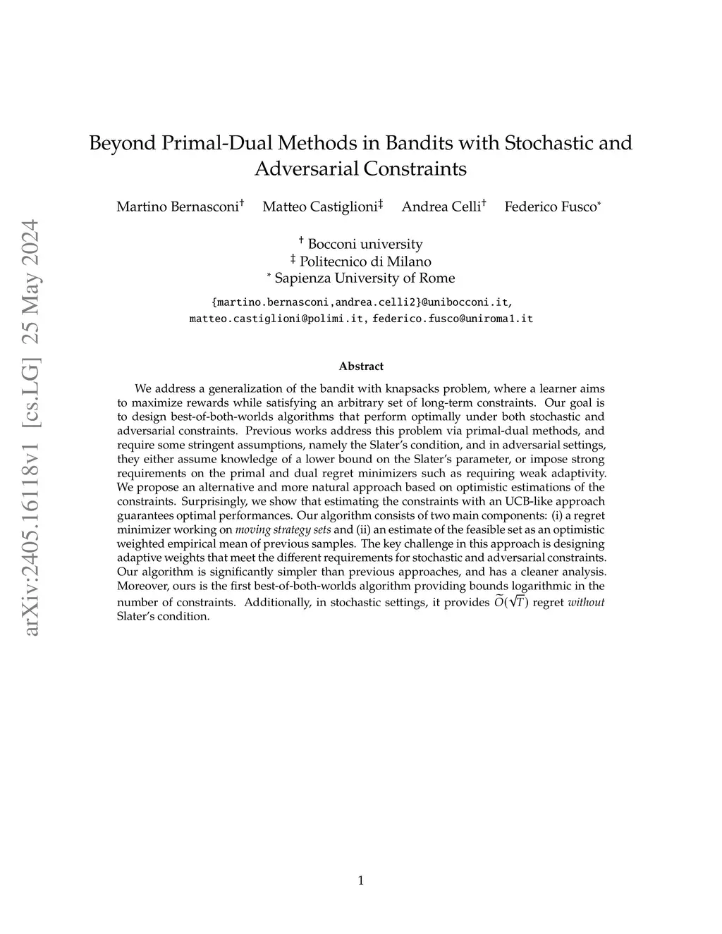 We address a generalization of the bandit with knapsacks problem, where a learner aims to maximize rewards while satisfying an arbitrary set of long-term constraints. Our goal is to design best-of-both-worlds algorithms that perform optimally under both stochastic and adversarial constraints. Previous works address this problem via primal-dual methods, and require some stringent assumptions, namely the Slater's condition, and in adversarial settings, they either assume knowledge of a lower bound on the Slater's parameter, or impose strong requirements on the primal and dual regret minimizers such as requiring weak adaptivity. We propose an alternative and more natural approach based on optimistic estimations of the constraints. Surprisingly, we show that estimating the constraints with an UCB-like approach guarantees optimal performances. Our algorithm consists of two main components: (i) a regret minimizer working on \emph{moving strategy sets} and (ii) an estimate of the feasible set as an optimistic weighted empirical mean of previous samples. The key challenge in this approach is designing adaptive weights that meet the different requirements for stochastic and adversarial constraints. Our algorithm is significantly simpler than previous approaches, and has a cleaner analysis. Moreover, ours is the first best-of-both-worlds algorithm providing bounds logarithmic in the number of constraints. Additionally, in stochastic settings, it provides regret \emph{without} Slater's condition.