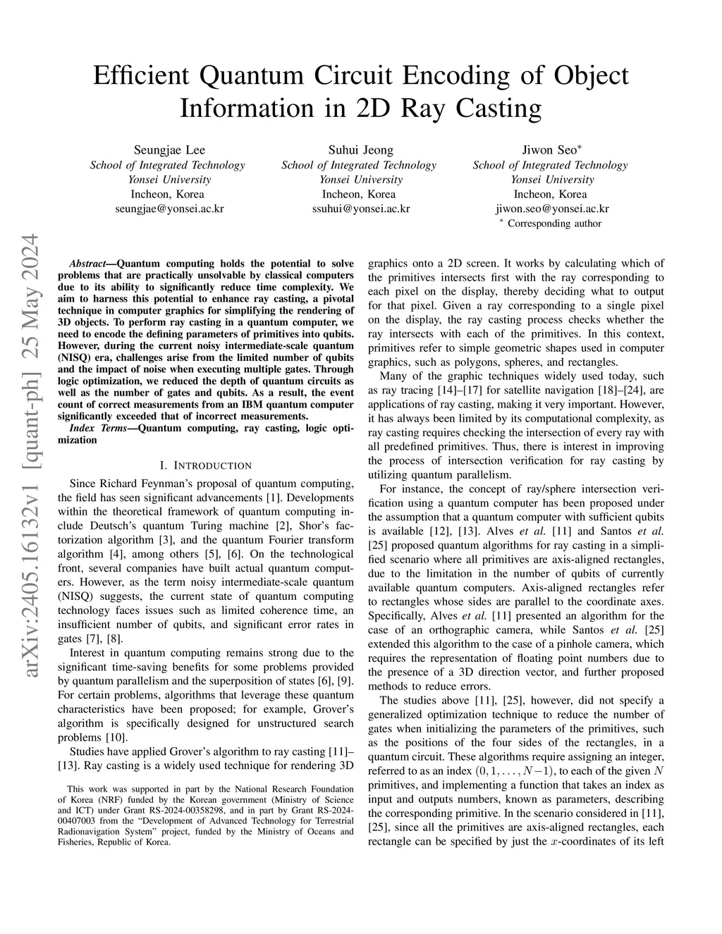 Quantum computing holds the potential to solve problems that are practically unsolvable by classical computers due to its ability to significantly reduce time complexity. We aim to harness this potential to enhance ray casting, a pivotal technique in computer graphics for simplifying the rendering of 3D objects. To perform ray casting in a quantum computer, we need to encode the defining parameters of primitives into qubits. However, during the current noisy intermediate-scale quantum (NISQ) era, challenges arise from the limited number of qubits and the impact of noise when executing multiple gates. Through logic optimization, we reduced the depth of quantum circuits as well as the number of gates and qubits. As a result, the event count of correct measurements from an IBM quantum computer significantly exceeded that of incorrect measurements.