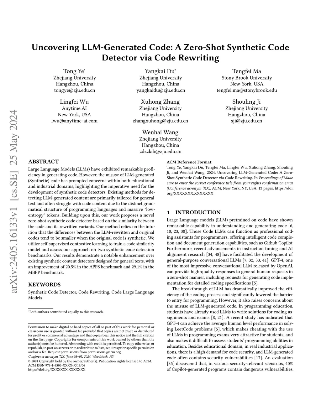 Large Language Models (LLMs) have exhibited remarkable proficiency in generating code. However, the misuse of LLM-generated (Synthetic) code has prompted concerns within both educational and industrial domains, highlighting the imperative need for the development of synthetic code detectors. Existing methods for detecting LLM-generated content are primarily tailored for general text and often struggle with code content due to the distinct grammatical structure of programming languages and massive "low-entropy" tokens. Building upon this, our work proposes a novel zero-shot synthetic code detector based on the similarity between the code and its rewritten variants. Our method relies on the intuition that the differences between the LLM-rewritten and original codes tend to be smaller when the original code is synthetic. We utilize self-supervised contrastive learning to train a code similarity model and assess our approach on two synthetic code detection benchmarks. Our results demonstrate a notable enhancement over existing synthetic content detectors designed for general texts, with an improvement of 20.5% in the APPS benchmark and 29.1% in the MBPP benchmark.