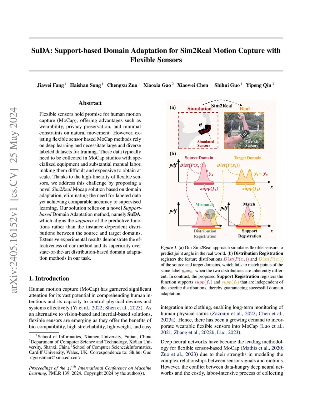 Flexible sensors hold promise for human motion capture (MoCap), offering advantages such as wearability, privacy preservation, and minimal constraints on natural movement. However, existing flexible sensor-based MoCap methods rely on deep learning and necessitate large and diverse labeled datasets for training. These data typically need to be collected in MoCap studios with specialized equipment and substantial manual labor, making them difficult and expensive to obtain at scale. Thanks to the high-linearity of flexible sensors, we address this challenge by proposing a novel Sim2Real Mocap solution based on domain adaptation, eliminating the need for labeled data yet achieving comparable accuracy to supervised learning. Our solution relies on a novel Support-based Domain Adaptation method, namely SuDA, which aligns the supports of the predictive functions rather than the instance-dependent distributions between the source and target domains. Extensive experimental results demonstrate the effectiveness of our method andits superiority over state-of-the-art distribution-based domain adaptation methods in our task.