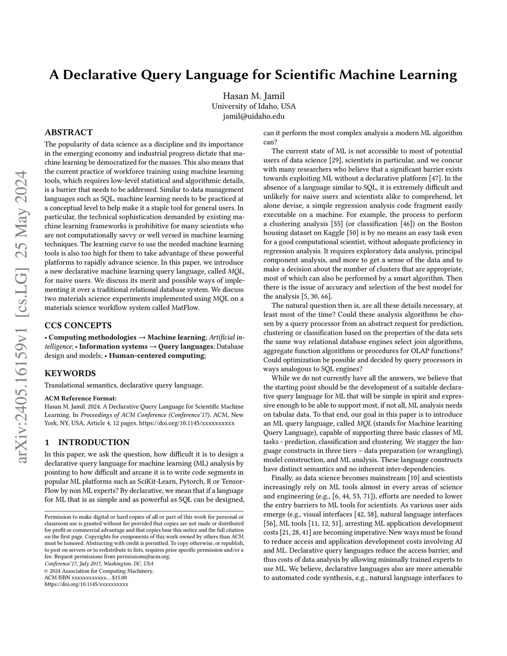 The popularity of data science as a discipline and its importance in the emerging economy and industrial progress dictate that machine learning be democratized for the masses. This also means that the current practice of workforce training using machine learning tools, which requires low-level statistical and algorithmic details, is a barrier that needs to be addressed. Similar to data management languages such as SQL, machine learning needs to be practiced at a conceptual level to help make it a staple tool for general users. In particular, the technical sophistication demanded by existing machine learning frameworks is prohibitive for many scientists who are not computationally savvy or well versed in machine learning techniques. The learning curve to use the needed machine learning tools is also too high for them to take advantage of these powerful platforms to rapidly advance science. In this paper, we introduce a new declarative machine learning query language, called {\em MQL}, for naive users. We discuss its merit and possible ways of implementing it over a traditional relational database system. We discuss two materials science experiments implemented using MQL on a materials science workflow system called MatFlow.