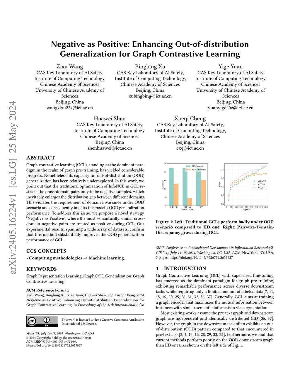 Graph contrastive learning (GCL), standing as the dominant paradigm in the realm of graph pre-training, has yielded considerable progress. Nonetheless, its capacity for out-of-distribution (OOD) generalization has been relatively underexplored. In this work, we point out that the traditional optimization of InfoNCE in GCL restricts the cross-domain pairs only to be negative samples, which inevitably enlarges the distribution gap between different domains. This violates the requirement of domain invariance under OOD scenario and consequently impairs the model's OOD generalization performance. To address this issue, we propose a novel strategy "Negative as Positive", where the most semantically similar cross-domain negative pairs are treated as positive during GCL. Our experimental results, spanning a wide array of datasets, confirm that this method substantially improves the OOD generalization performance of GCL.
