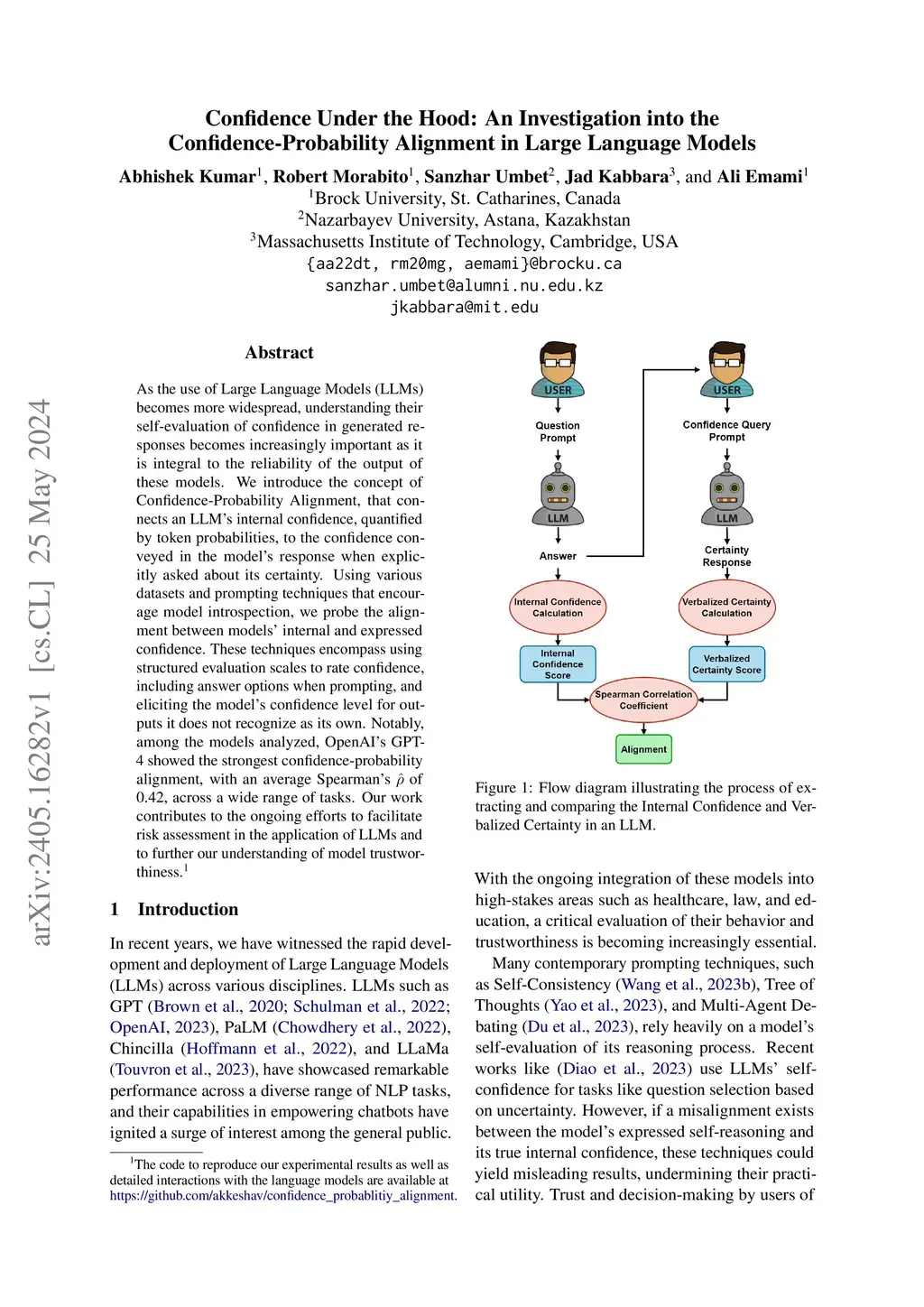 As the use of Large Language Models (LLMs) becomes more widespread, understanding their self-evaluation of confidence in generated responses becomes increasingly important as it is integral to the reliability of the output of these models. We introduce the concept of Confidence-Probability Alignment, that connects an LLM's internal confidence, quantified by token probabilities, to the confidence conveyed in the model's response when explicitly asked about its certainty. Using various datasets and prompting techniques that encourage model introspection, we probe the alignment between models' internal and expressed confidence. These techniques encompass using structured evaluation scales to rate confidence, including answer options when prompting, and eliciting the model's confidence level for outputs it does not recognize as its own. Notably, among the models analyzed, OpenAI's GPT-4 showed the strongest confidence-probability alignment, with an average Spearman's ρ^\hat{\rho} of 0.42, across a wide range of tasks. Our work contributes to the ongoing efforts to facilitate risk assessment in the application of LLMs and to further our understanding of model trustworthiness.