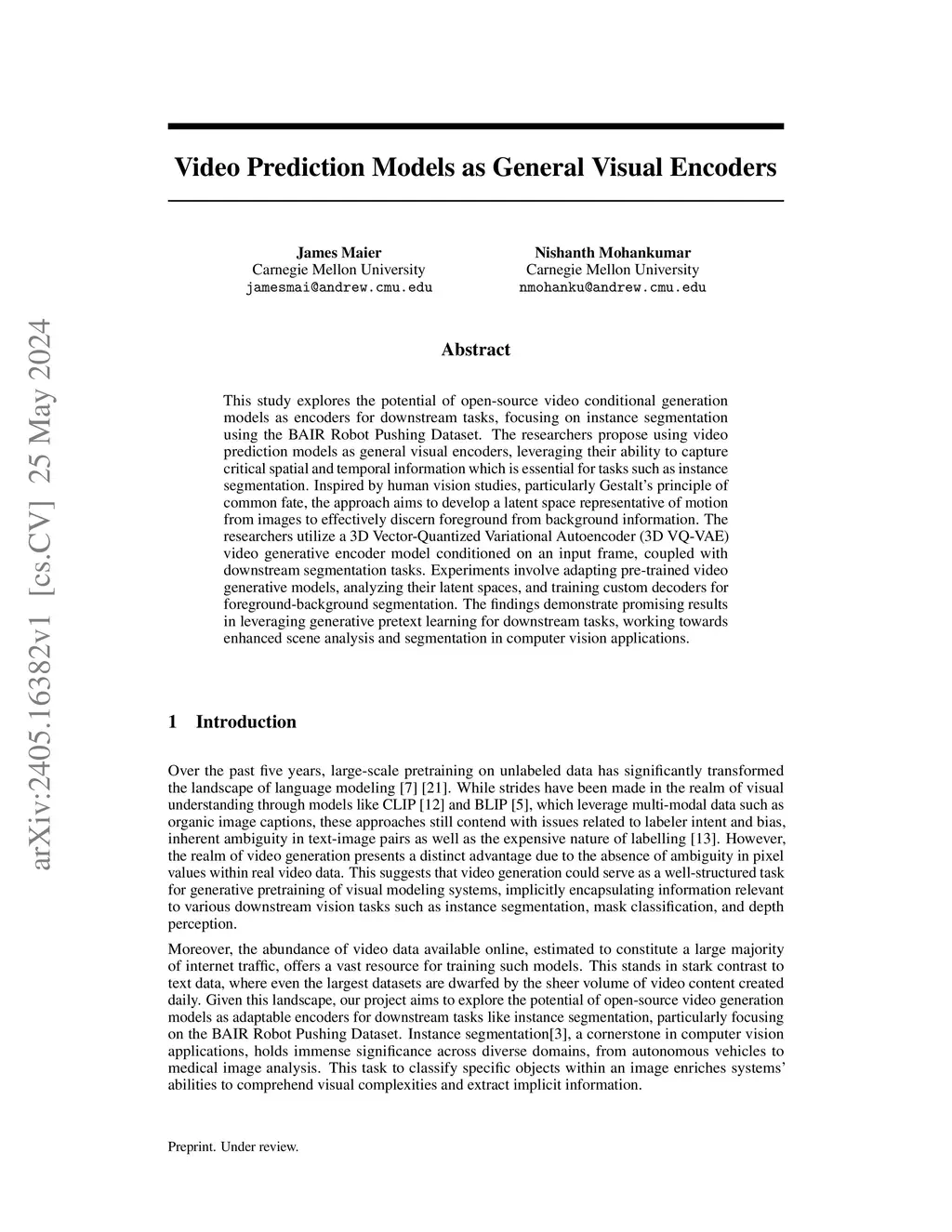 This study explores the potential of open-source video conditional generation models as encoders for downstream tasks, focusing on instance segmentation using the BAIR Robot Pushing Dataset. The researchers propose using video prediction models as general visual encoders, leveraging their ability to capture critical spatial and temporal information which is essential for tasks such as instance segmentation. Inspired by human vision studies, particularly Gestalts principle of common fate, the approach aims to develop a latent space representative of motion from images to effectively discern foreground from background information. The researchers utilize a 3D Vector-Quantized Variational Autoencoder 3D VQVAE video generative encoder model conditioned on an input frame, coupled with downstream segmentation tasks. Experiments involve adapting pre-trained video generative models, analyzing their latent spaces, and training custom decoders for foreground-background segmentation. The findings demonstrate promising results in leveraging generative pretext learning for downstream tasks, working towards enhanced scene analysis and segmentation in computer vision applications.