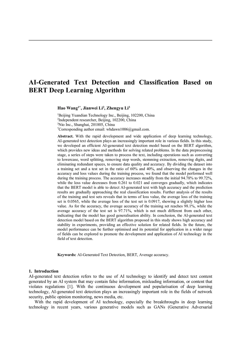 AI-generated text detection plays an increasingly important role in various fields. In this study, we developed an efficient AI-generated text detection model based on the BERT algorithm, which provides new ideas and methods for solving related problems. In the data preprocessing stage, a series of steps were taken to process the text, including operations such as converting to lowercase, word splitting, removing stop words, stemming extraction, removing digits, and eliminating redundant spaces, to ensure data quality and accuracy. By dividing the dataset into a training set and a test set in the ratio of 60% and 40%, and observing the changes in the accuracy and loss values during the training process, we found that the model performed well during the training process. The accuracy increases steadily from the initial 94.78% to 99.72%, while the loss value decreases from 0.261 to 0.021 and converges gradually, which indicates that the BERT model is able to detect AI-generated text with high accuracy and the prediction results are gradually approaching the real classification results. Further analysis of the results of the training and test sets reveals that in terms of loss value, the average loss of the training set is 0.0565, while the average loss of the test set is 0.0917, showing a slightly higher loss value. As for the accuracy, the average accuracy of the training set reaches 98.1%, while the average accuracy of the test set is 97.71%, which is not much different from each other, indicating that the model has good generalisation ability. In conclusion, the AI-generated text detection model based on the BERT algorithm proposed in this study shows high accuracy and stability in experiments, providing an effective solution for related fields.