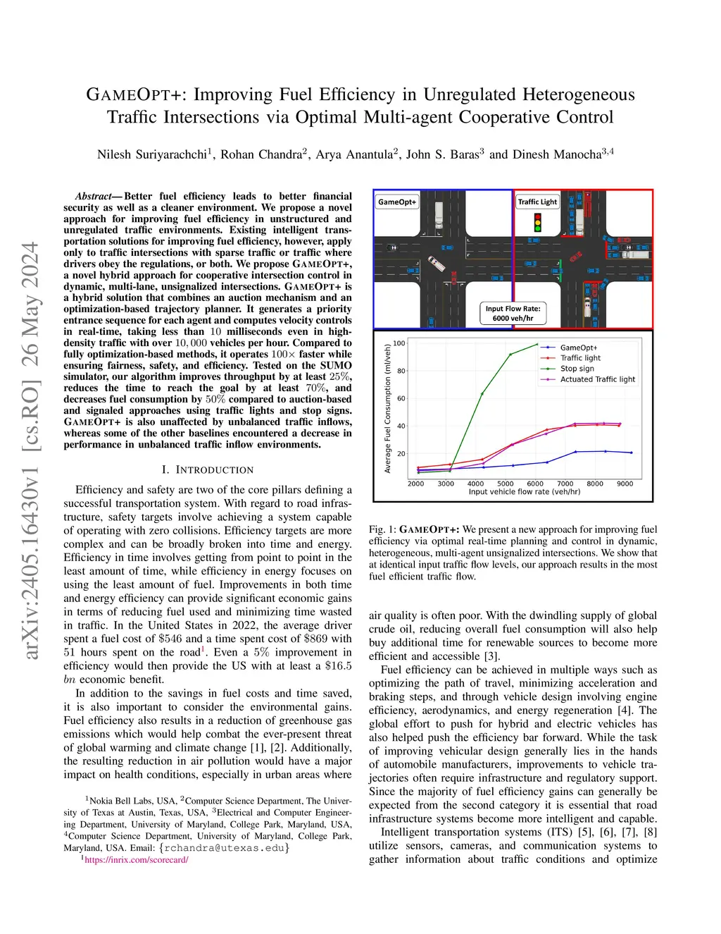 Better fuel efficiency leads to better financial security as well as a cleaner environment. We propose a novel approach for improving fuel efficiency in unstructured and unregulated traffic environments. Existing intelligent transportation solutions for improving fuel efficiency, however, apply only to traffic intersections with sparse traffic or traffic where drivers obey the regulations, or both. We propose GameOpt+, a novel hybrid approach for cooperative intersection control in dynamic, multi-lane, unsignalized intersections. GameOpt+ is a hybrid solution that combines an auction mechanism and an optimization-based trajectory planner. It generates a priority entrance sequence for each agent and computes velocity controls in real-time, taking less than 10 milliseconds even in high-density traffic with over 10,000 vehicles per hour. Compared to fully optimization-based methods, it operates 100 times faster while ensuring fairness, safety, and efficiency. Tested on the SUMO simulator, our algorithm improves throughput by at least 25%, reduces the time to reach the goal by at least 70%, and decreases fuel consumption by 50% compared to auction-based and signaled approaches using traffic lights and stop signs. GameOpt+ is also unaffected by unbalanced traffic inflows, whereas some of the other baselines encountered a decrease in performance in unbalanced traffic inflow environments.