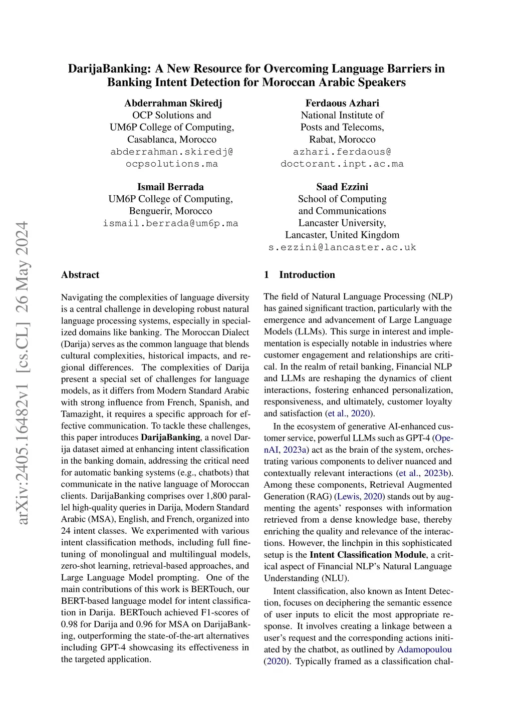 Navigating the complexities of language diversity is a central challenge in developing robust natural language processing systems, especially in specialized domains like banking. The Moroccan Dialect (Darija) serves as the common language that blends cultural complexities, historical impacts, and regional differences. The complexities of Darija present a special set of challenges for language models, as it differs from Modern Standard Arabic with strong influence from French, Spanish, and Tamazight, it requires a specific approach for effective communication. To tackle these challenges, this paper introduces \textbf{DarijaBanking}, a novel Darija dataset aimed at enhancing intent classification in the banking domain, addressing the critical need for automatic banking systems (e.g., chatbots) that communicate in the native language of Moroccan clients. DarijaBanking comprises over 1,800 parallel high-quality queries in Darija, Modern Standard Arabic (MSA), English, and French, organized into 24 intent classes. We experimented with various intent classification methods, including full fine-tuning of monolingual and multilingual models, zero-shot learning, retrieval-based approaches, and Large Language Model prompting. One of the main contributions of this work is BERTouch, our BERT-based language model for intent classification in Darija. BERTouch achieved F1-scores of 0.98 for Darija and 0.96 for MSA on DarijaBanking, outperforming the state-of-the-art alternatives including GPT-4 showcasing its effectiveness in the targeted application.