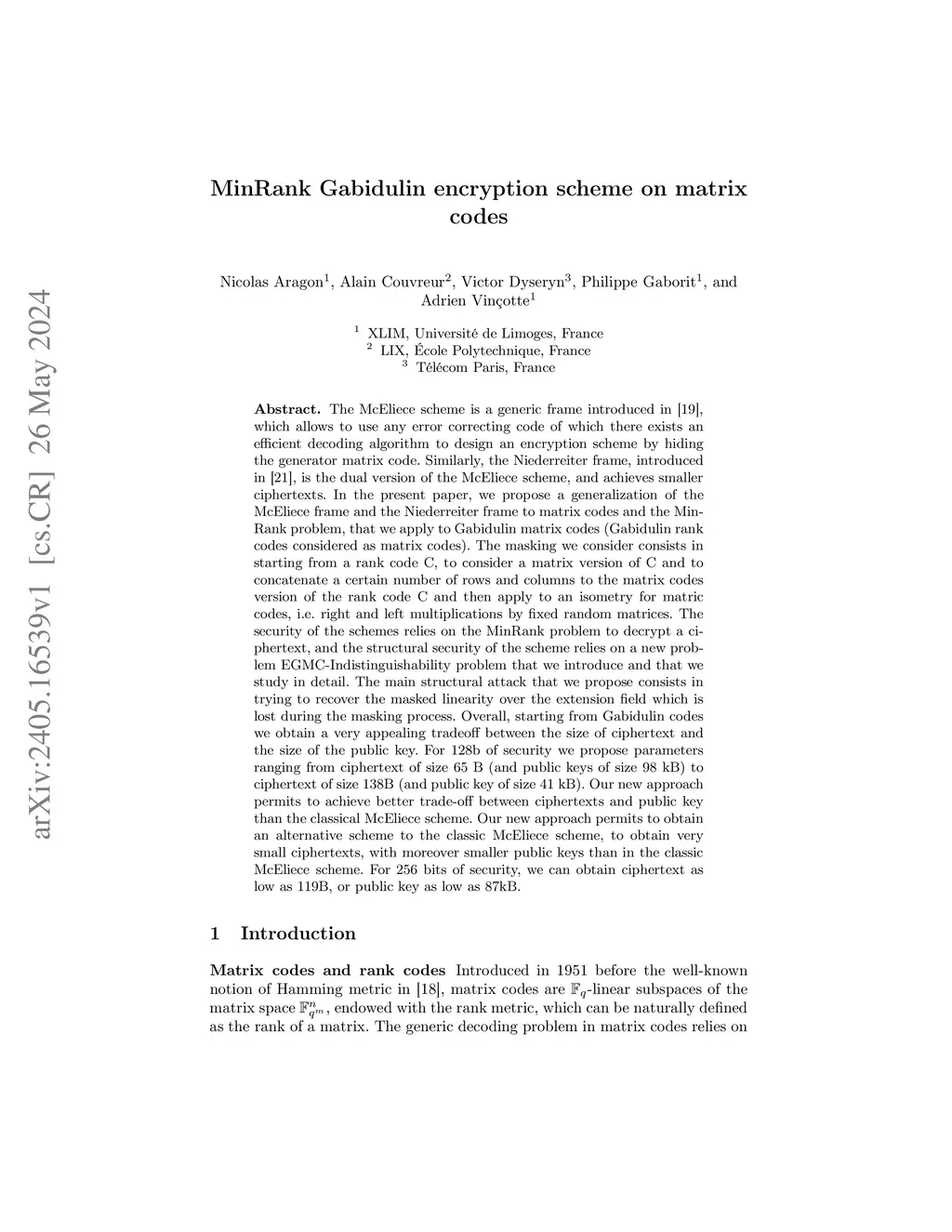 The McEliece scheme is a generic frame which allows to use any error correcting code of which there exists an efficient decoding algorithm to design an encryption scheme by hiding the generator matrix code. Similarly, the Niederreiter frame is the dual version of the McEliece scheme, and achieves smaller ciphertexts. We propose a generalization of the McEliece frame and the Niederreiter frame to matrix codes and the MinRank problem, that we apply to Gabidulin matrix codes (Gabidulin rank codes considered as matrix codes). The masking we consider consists in starting from a rank code C, to consider a matrix version of C and to concatenate a certain number of rows and columns to the matrix codes version of the rank code C and then apply to an isometry for matric codes. The security of the schemes relies on the MinRank problem to decrypt a ciphertext, and the structural security of the scheme relies on a new problem EGMC-Indistinguishability problem that we introduce and that we study in detail. The main structural attack that we propose consists in trying to recover the masked linearity over the extension field which is lost during the masking process. Overall, starting from Gabidulin codes we obtain a very appealing tradeoff between the size of ciphertext and the size of the public key. For 128b of security we propose parameters ranging from ciphertext of size 65 B (and public keys of size 98 kB) to ciphertext of size 138B (and public key of size 41 kB). Our new approach permits to achieve better trade-off between ciphertexts and public key than the classical McEliece scheme. Our new approach permits to obtain an alternative scheme to the classic McEliece scheme, to obtain very small ciphertexts, with moreover smaller public keys than in the classic McEliece scheme. For 256 bits of security, we can obtain ciphertext as low as 119B, or public key as low as 87kB.