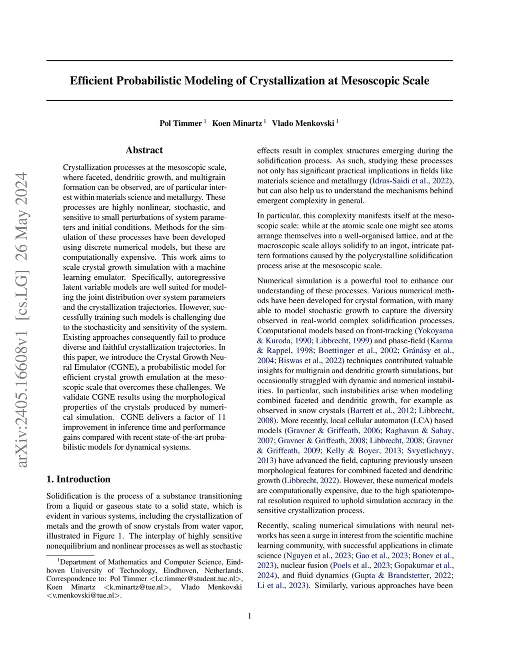 Crystallization processes at the mesoscopic scale, where faceted, dendritic growth, and multigrain formation can be observed, are of particular interest within materials science and metallurgy. These processes are highly nonlinear, stochastic, and sensitive to small perturbations of system parameters and initial conditions. Methods for the simulation of these processes have been developed using discrete numerical models, but these are computationally expensive. This work aims to scale crystal growth simulation with a machine learning emulator. Specifically, autoregressive latent variable models are well suited for modeling the joint distribution over system parameters and the crystallization trajectories. However, successfully training such models is challenging due to the stochasticity and sensitivity of the system. Existing approaches consequently fail to produce diverse and faithful crystallization trajectories. In this paper, we introduce the Crystal Growth Neural Emulator (CGNE), a probabilistic model for efficient crystal growth emulation at the mesoscopic scale that overcomes these challenges. We validate CGNE results using the morphological properties of the crystals produced by numerical simulation. CGNE delivers a factor of 11 improvement in inference time and performance gains compared with recent state-of-the-art probabilistic models for dynamical systems.