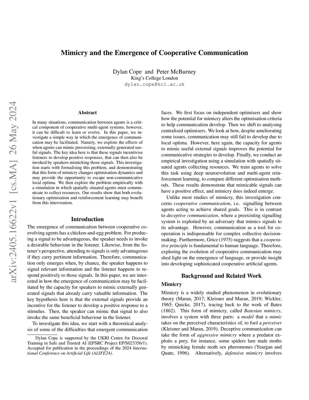 In many situations, communication between agents is a critical component of cooperative multi-agent systems, however, it can be difficult to learn or evolve. In this paper, we investigate a simple way in which the emergence of communication may be facilitated. Namely, we explore the effects of when agents can mimic preexisting, externally generated useful signals. The key idea here is that these signals incentivise listeners to develop positive responses, that can then also be invoked by speakers mimicking those signals. This investigation starts with formalising this problem, and demonstrating that this form of mimicry changes optimisation dynamics and may provide the opportunity to escape non-communicative local optima. We then explore the problem empirically with a simulation in which spatially situated agents must communicate to collect resources. Our results show that both evolutionary optimisation and reinforcement learning may benefit from this intervention.