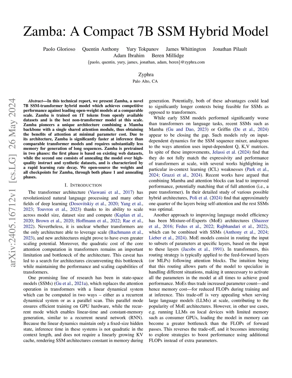 In this technical report, we present Zamba, a novel 7B SSM-transformer hybrid model which achieves competitive performance against leading open-weight models at a comparable scale. Zamba is trained on 1T tokens from openly available datasets and is the best non-transformer model at this scale. Zamba pioneers a unique architecture combining a Mamba backbone with a single shared attention module, thus obtaining the benefits of attention at minimal parameter cost. Due to its architecture, Zamba is significantly faster at inference than comparable transformer models and requires substantially less memory for generation of long sequences. Zamba is pretrained in two phases: the first phase is based on existing web datasets, while the second one consists of annealing the model over high-quality instruct and synthetic datasets, and is characterized by a rapid learning rate decay. We open-source the weights and all checkpoints for Zamba, through both phase 1 and annealing phases.