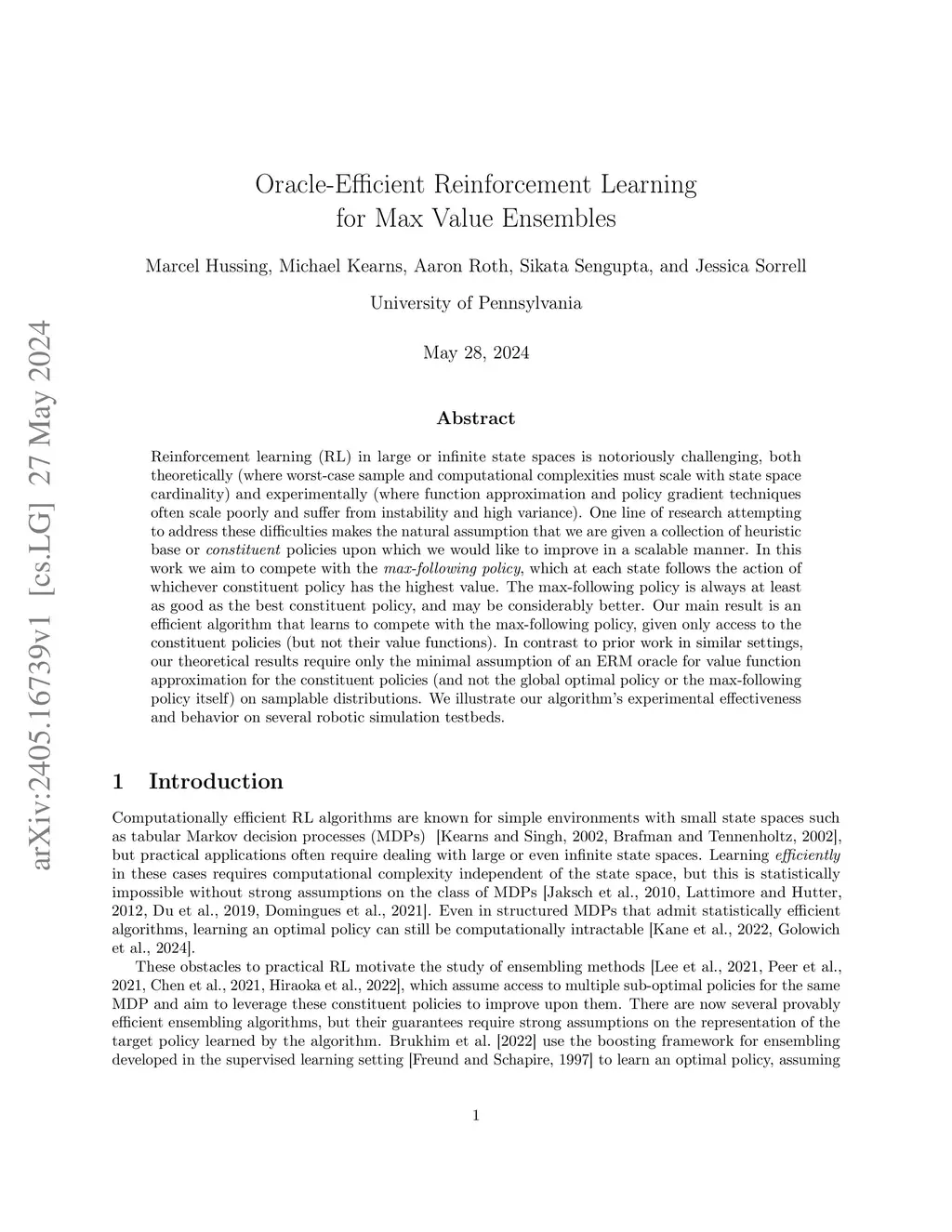 Reinforcement learning (RL) in large or infinite state spaces is notoriously challenging, both theoretically (where worst-case sample and computational complexities must scale with state space cardinality) and experimentally (where function approximation and policy gradient techniques often scale poorly and suffer from instability and high variance). One line of research attempting to address these difficulties makes the natural assumption that we are given a collection of heuristic base or policies upon which we would like to improve in a scalable manner. In this work we aim to compete with the , which at each state follows the action of whichever constituent policy has the highest value. The max-following policy is always at least as good as the best constituent policy, and may be considerably better. Our main result is an efficient algorithm that learns to compete with the max-following policy, given only access to the constituent policies (but not their value functions). In contrast to prior work in similar settings, our theoretical results require only the minimal assumption of an ERM oracle for value function approximation for the constituent policies (and not the global optimal policy or the max-following policy itself) on samplable distributions. We illustrate our algorithm's experimental effectiveness and behavior on several robotic simulation testbeds.