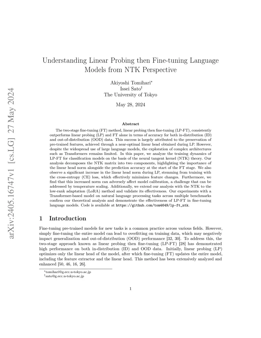 The two-stage fine-tuning (FT) method, linear probing then fine-tuning (LP-FT), consistently outperforms linear probing (LP) and FT alone in terms of accuracy for both in-distribution (ID) and out-of-distribution (OOD) data. This success is largely attributed to the preservation of pre-trained features, achieved through a near-optimal linear head obtained during LP. However, despite the widespread use of large language models, the exploration of complex architectures such as Transformers remains limited. In this paper, we analyze the training dynamics of LP-FT for classification models on the basis of the neural tangent kernel (NTK) theory. Our analysis decomposes the NTK matrix into two components, highlighting the importance of the linear head norm alongside the prediction accuracy at the start of the FT stage. We also observe a significant increase in the linear head norm during LP, stemming from training with the cross-entropy (CE) loss, which effectively minimizes feature changes. Furthermore, we find that this increased norm can adversely affect model calibration, a challenge that can be addressed by temperature scaling. Additionally, we extend our analysis with the NTK to the low-rank adaptation (LoRA) method and validate its effectiveness. Our experiments with a Transformer-based model on natural language processing tasks across multiple benchmarks confirm our theoretical analysis and demonstrate the effectiveness of LP-FT in fine-tuning language models. Code is available at https://github.com/tom4649/lp-ft_ntk.