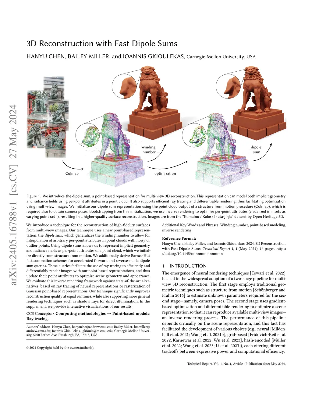 We introduce a technique for the reconstruction of high-fidelity surfaces from multi-view images. Our technique uses a new point-based representation, the dipole sum, which generalizes the winding number to allow for interpolation of arbitrary per-point attributes in point clouds with noisy or outlier points. Using dipole sums allows us to represent implicit geometry and radiance fields as per-point attributes of a point cloud, which we initialize directly from structure from motion. We additionally derive Barnes-Hut fast summation schemes for accelerated forward and reverse-mode dipole sum queries. These queries facilitate the use of ray tracing to efficiently and differentiably render images with our point-based representations, and thus update their point attributes to optimize scene geometry and appearance. We evaluate this inverse rendering framework against state-of-the-art alternatives, based on ray tracing of neural representations or rasterization of Gaussian point-based representations. Our technique significantly improves reconstruction quality at equal runtimes, while also supporting more general rendering techniques such as shadow rays for direct illumination. In the supplement, we provide interactive visualizations of our results.