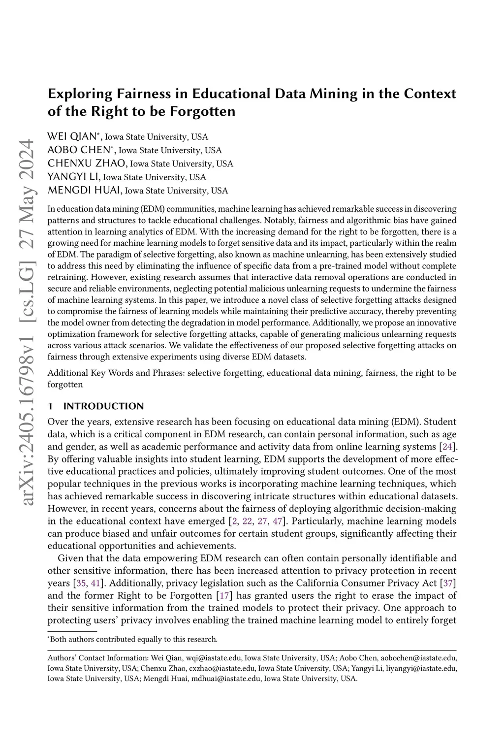 In education data mining (EDM) communities, machine learning has achieved remarkable success in discovering patterns and structures to tackle educational challenges. Notably, fairness and algorithmic bias have gained attention in learning analytics of EDM. With the increasing demand for the right to be forgotten, there is a growing need for machine learning models to forget sensitive data and its impact, particularly within the realm of EDM. The paradigm of selective forgetting, also known as machine unlearning, has been extensively studied to address this need by eliminating the influence of specific data from a pre-trained model without complete retraining. However, existing research assumes that interactive data removal operations are conducted in secure and reliable environments, neglecting potential malicious unlearning requests to undermine the fairness of machine learning systems. In this paper, we introduce a novel class of selective forgetting attacks designed to compromise the fairness of learning models while maintaining their predictive accuracy, thereby preventing the model owner from detecting the degradation in model performance. Additionally, we propose an innovative optimization framework for selective forgetting attacks, capable of generating malicious unlearning requests across various attack scenarios. We validate the effectiveness of our proposed selective forgetting attacks on fairness through extensive experiments using diverse EDM datasets.