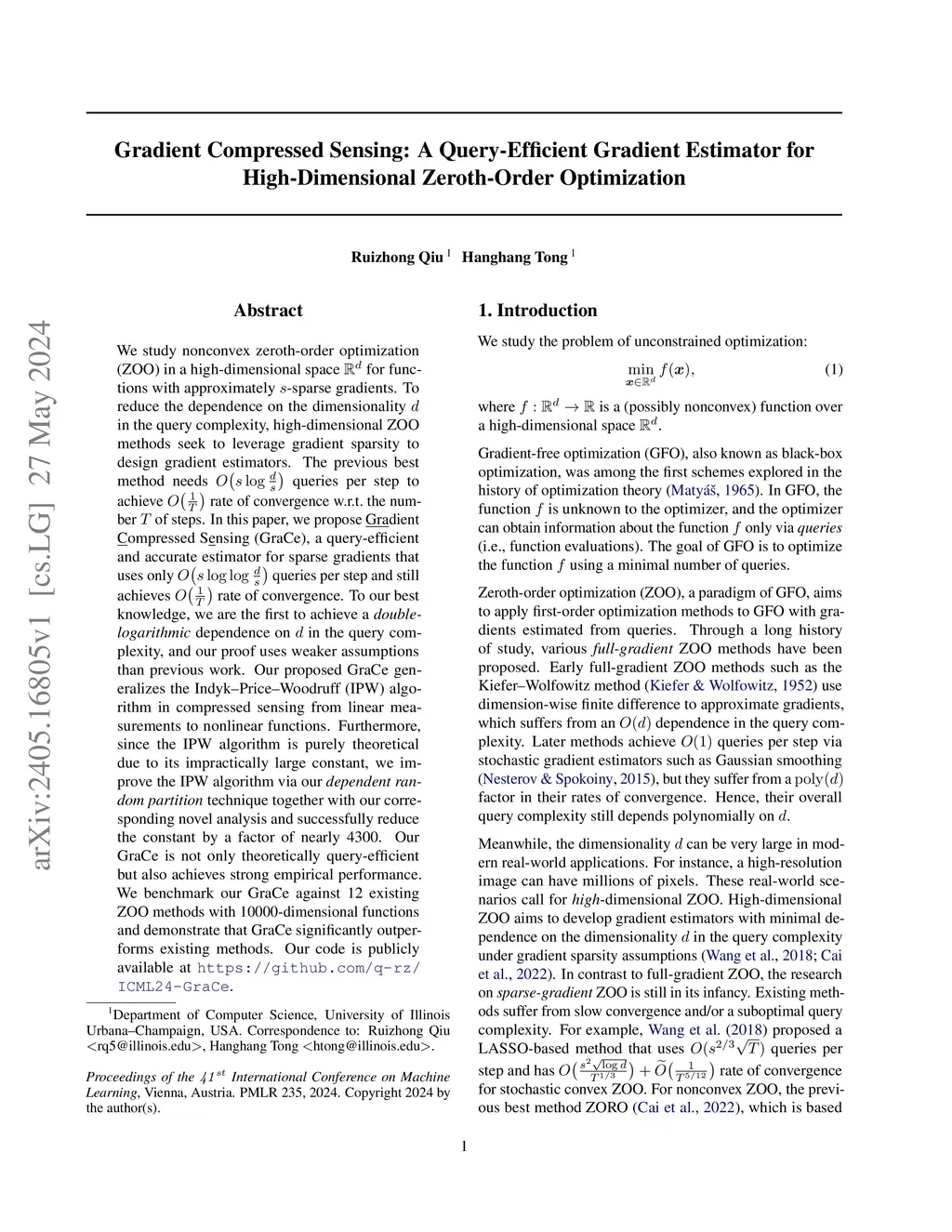We study nonconvex zeroth-order optimization (ZOO) in a high-dimensional space for functions with approximately -sparse gradients. To reduce the dependence on the dimensionality in the query complexity, high-dimensional ZOO methods seek to leverage gradient sparsity to design gradient estimators. The previous best method needs queries per step to achieve rate of convergence w.r.t. the number T of steps. In this paper, we propose *Gradient Compressed Sensing* (GraCe), a query-efficient and accurate estimator for sparse gradients that uses only queries per step and still achieves rate of convergence. To our best knowledge, we are the first to achieve a *double-logarithmic* dependence on in the query complexity under weaker assumptions. Our proposed GraCe generalizes the Indyk--Price--Woodruff (IPW) algorithm in compressed sensing from linear measurements to nonlinear functions. Furthermore, since the IPW algorithm is purely theoretical due to its impractically large constant, we improve the IPW algorithm via our *dependent random partition* technique together with our corresponding novel analysis and successfully reduce the constant by a factor of nearly 4300. Our GraCe is not only theoretically query-efficient but also achieves strong empirical performance. We benchmark our GraCe against 12 existing ZOO methods with 10000-dimensional functions and demonstrate that GraCe significantly outperforms existing methods.