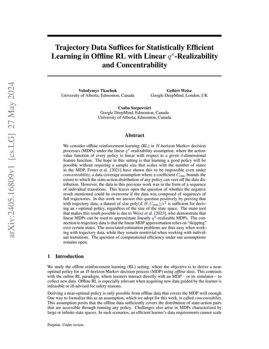 We consider offline reinforcement learning (RL) in -horizon Markov decision processes (MDPs) under the linear -realizability assumption, where the action-value function of every policy is linear with respect to a given -dimensional feature function. The hope in this setting is that learning a good policy will be possible without requiring a sample size that scales with the number of states in the MDP. Foster et al. [2021] have shown this to be impossible even under , a data coverage assumption where a coefficient bounds the extent to which the state-action distribution of any policy can veer off the data distribution. However, the data in this previous work was in the form of a sequence of individual transitions. This leaves open the question of whether the negative result mentioned could be overcome if the data was composed of sequences of full trajectories. In this work we answer this question positively by proving that with trajectory data, a dataset of size is sufficient for deriving an -optimal policy, regardless of the size of the state space. The main tool that makes this result possible is due to Weisz et al. [2023], who demonstrate that linear MDPs can be used to approximate linearly -realizable MDPs. The connection to trajectory data is that the linear MDP approximation relies on "skipping" over certain states. The associated estimation problems are thus easy when working with trajectory data, while they remain nontrivial when working with individual transitions. The question of computational efficiency under our assumptions remains open.