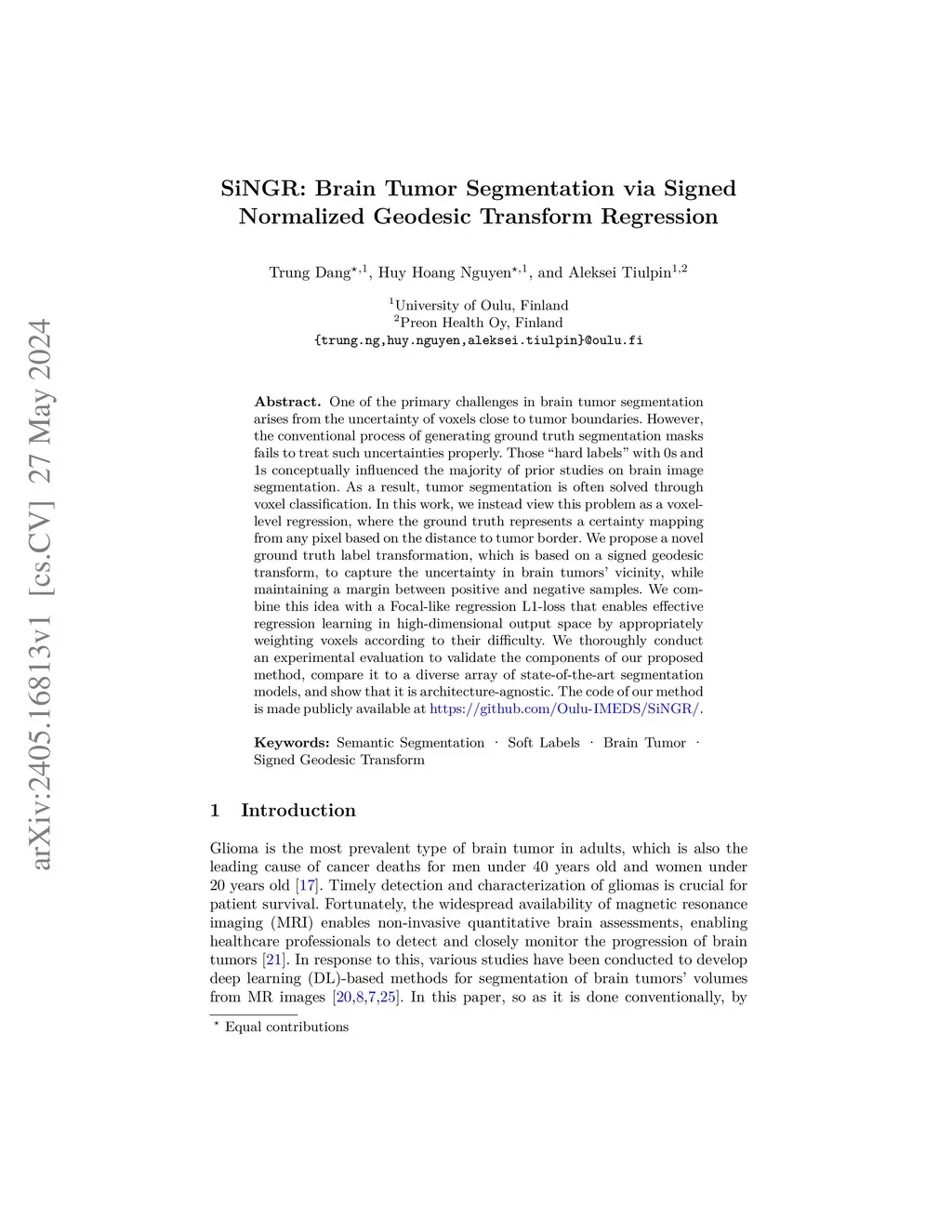 SiNGR: Brain Tumor Segmentation via Signed Normalized Geodesic Transform
