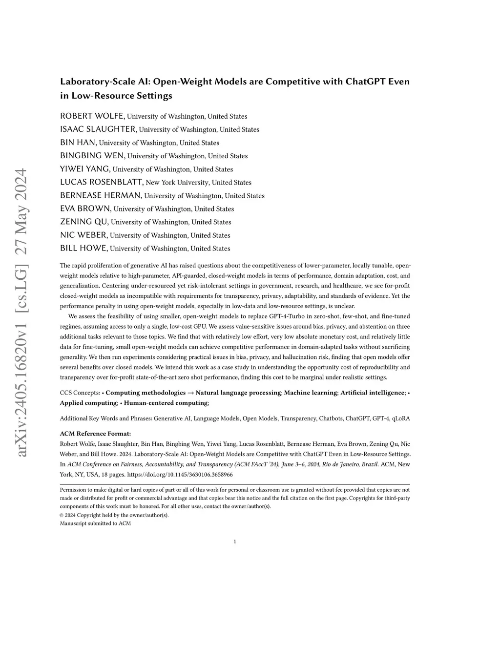 The rapid proliferation of generative AI has raised questions about the competitiveness of lower-parameter, locally tunable, open-weight models relative to high-parameter, API-guarded, closed-weight models in terms of performance, domain adaptation, cost, and generalization. Centering under-resourced yet risk-intolerant settings in government, research, and healthcare, we see for-profit closed-weight models as incompatible with requirements for transparency, privacy, adaptability, and standards of evidence. Yet the performance penalty in using open-weight models, especially in low-data and low-resource settings, is unclear. We assess the feasibility of using smaller, open-weight models to replace GPT-4-Turbo in zero-shot, few-shot, and fine-tuned regimes, assuming access to only a single, low-cost GPU. We assess value-sensitive issues around bias, privacy, and abstention on three additional tasks relevant to those topics. We find that with relatively low effort, very low absolute monetary cost, and relatively little data for fine-tuning, small open-weight models can achieve competitive performance in domain-adapted tasks without sacrificing generality. We then run experiments considering practical issues in bias, privacy, and hallucination risk, finding that open models offer several benefits over closed models. We intend this work as a case study in understanding the opportunity cost of reproducibility and transparency over for-profit state-of-the-art zero shot performance, finding this cost to be marginal under realistic settings.