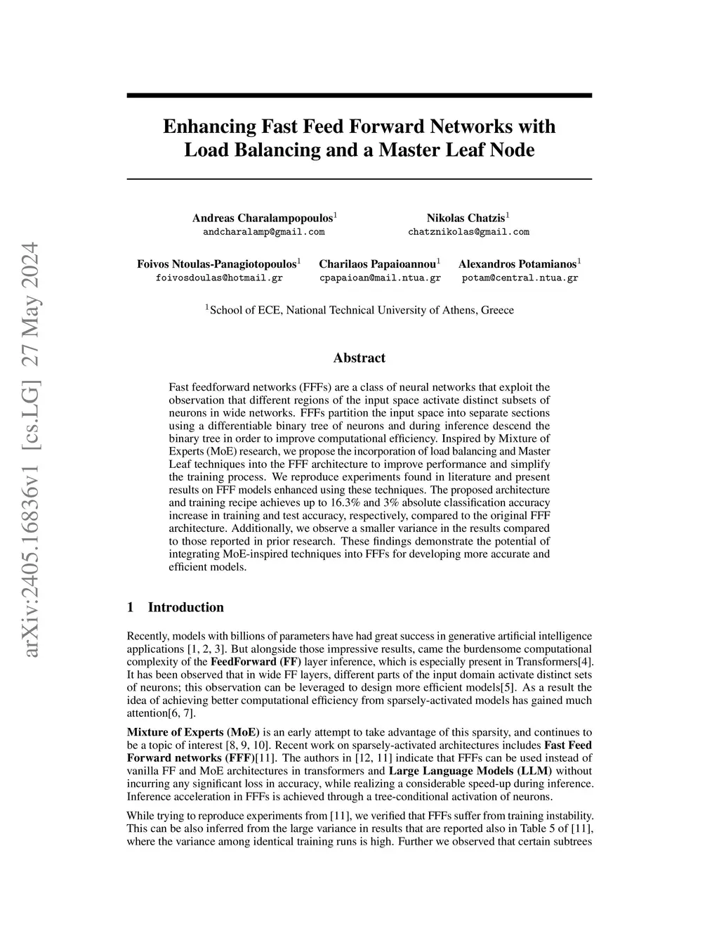 Fast feedforward networks (FFFs) are a class of neural networks that exploit the observation that different regions of the input space activate distinct subsets of neurons in wide networks. FFFs partition the input space into separate sections using a differentiable binary tree of neurons and during inference descend the binary tree in order to improve computational efficiency. Inspired by Mixture of Experts (MoE) research, we propose the incorporation of load balancing and Master Leaf techniques into the FFF architecture to improve performance and simplify the training process. We reproduce experiments found in literature and present results on FFF models enhanced using these techniques. The proposed architecture and training recipe achieves up to 16.3% and 3% absolute classification accuracy increase in training and test accuracy, respectively, compared to the original FFF architecture. Additionally, we observe a smaller variance in the results compared to those reported in prior research. These findings demonstrate the potential of integrating MoE-inspired techniques into FFFs for developing more accurate and efficient models.