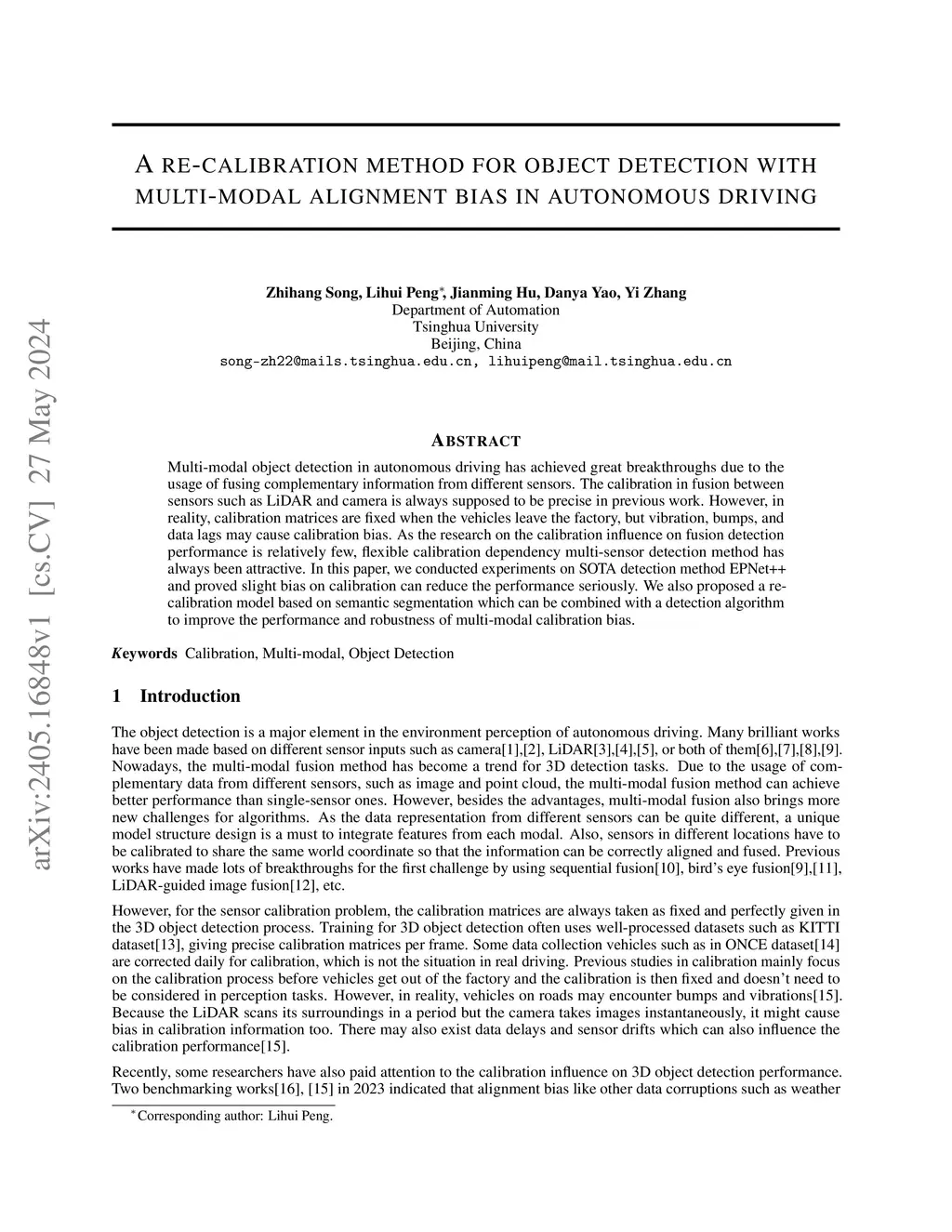 A re-calibration method for object detection with multi-modal alignment bias in autonomous driving