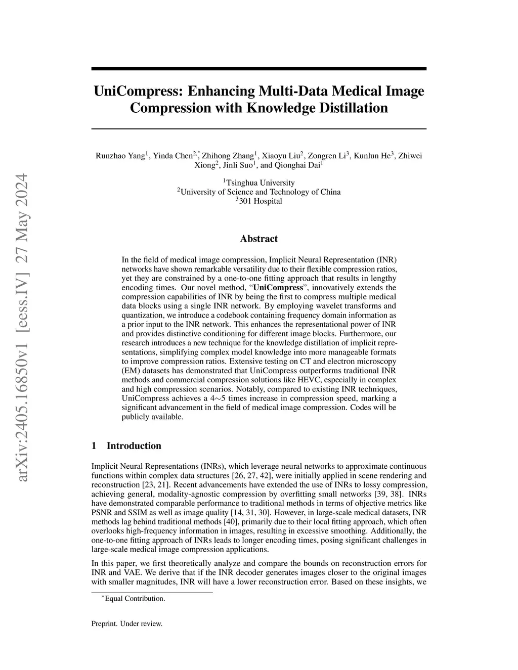In the field of medical image compression, Implicit Neural Representation (INR) networks have shown remarkable versatility due to their flexible compression ratios, yet they are constrained by a one-to-one fitting approach that results in lengthy encoding times. Our novel method, ``\textbf{UniCompress}'', innovatively extends the compression capabilities of INR by being the first to compress multiple medical data blocks using a single INR network. By employing wavelet transforms and quantization, we introduce a codebook containing frequency domain information as a prior input to the INR network. This enhances the representational power of INR and provides distinctive conditioning for different image blocks. Furthermore, our research introduces a new technique for the knowledge distillation of implicit representations, simplifying complex model knowledge into more manageable formats to improve compression ratios. Extensive testing on CT and electron microscopy (EM) datasets has demonstrated that UniCompress outperforms traditional INR methods and commercial compression solutions like HEVC, especially in complex and high compression scenarios. Notably, compared to existing INR techniques, UniCompress achieves a 45 times increase in compression speed, marking a significant advancement in the field of medical image compression. Codes will be publicly available.