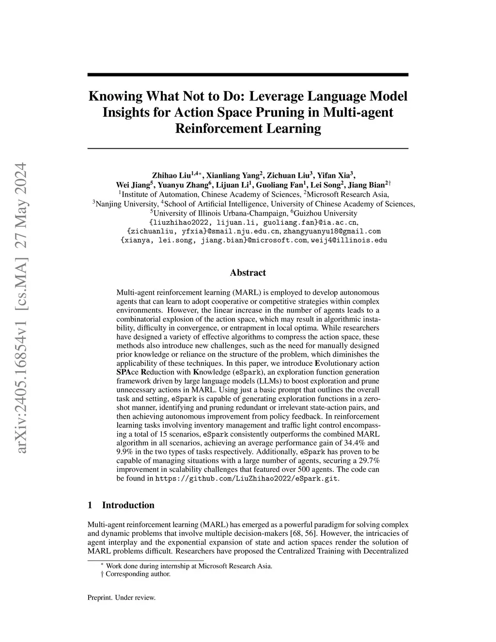 Multi-agent reinforcement learning (MARL) is employed to develop autonomous agents that can learn to adopt cooperative or competitive strategies within complex environments. However, the linear increase in the number of agents leads to a combinatorial explosion of the action space, which may result in algorithmic instability, difficulty in convergence, or entrapment in local optima. While researchers have designed a variety of effective algorithms to compress the action space, these methods also introduce new challenges, such as the need for manually designed prior knowledge or reliance on the structure of the problem, which diminishes the applicability of these techniques. In this paper, we introduce Evolutionary action SPAce Reduction with Knowledge (eSpark), an exploration function generation framework driven by large language models (LLMs) to boost exploration and prune unnecessary actions in MARL. Using just a basic prompt that outlines the overall task and setting, eSpark is capable of generating exploration functions in a zero-shot manner, identifying and pruning redundant or irrelevant state-action pairs, and then achieving autonomous improvement from policy feedback. In reinforcement learning tasks involving inventory management and traffic light control encompassing a total of 15 scenarios, eSpark consistently outperforms the combined MARL algorithm in all scenarios, achieving an average performance gain of 34.4% and 9.9% in the two types of tasks respectively. Additionally, eSpark has proven to be capable of managing situations with a large number of agents, securing a 29.7% improvement in scalability challenges that featured over 500 agents. The code can be found in https://github.com/LiuZhihao2022/eSpark.git.