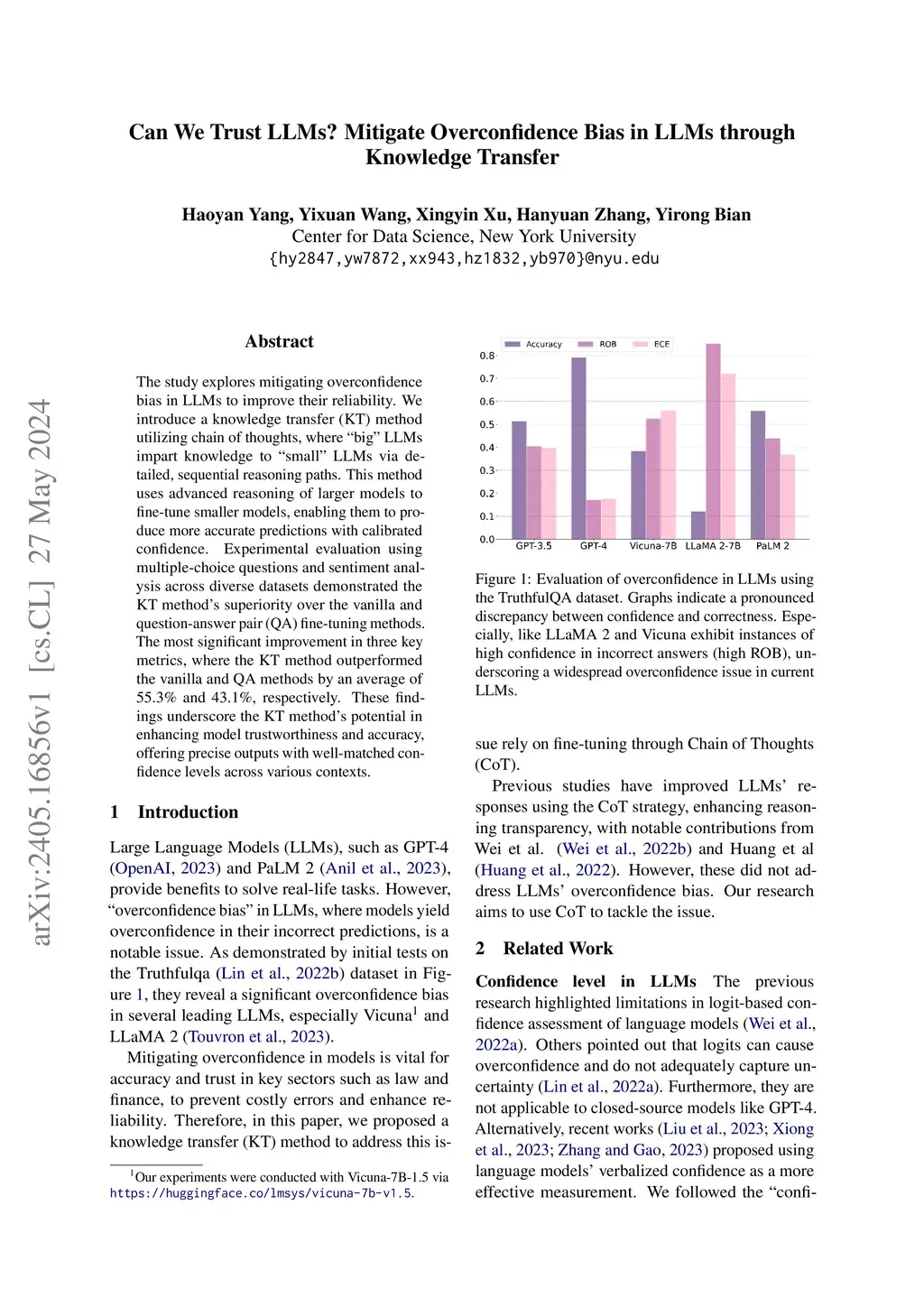 The study explores mitigating overconfidence bias in LLMs to improve their reliability. We introduce a knowledge transfer (KT) method utilizing chain of thoughts, where "big" LLMs impart knowledge to "small" LLMs via detailed, sequential reasoning paths. This method uses advanced reasoning of larger models to fine-tune smaller models, enabling them to produce more accurate predictions with calibrated confidence. Experimental evaluation using multiple-choice questions and sentiment analysis across diverse datasets demonstrated the KT method's superiority over the vanilla and question-answer pair (QA) fine-tuning methods. The most significant improvement in three key metrics, where the KT method outperformed the vanilla and QA methods by an average of 55.3% and 43.1%, respectively. These findings underscore the KT method's potential in enhancing model trustworthiness and accuracy, offering precise outputs with well-matched confidence levels across various contexts.