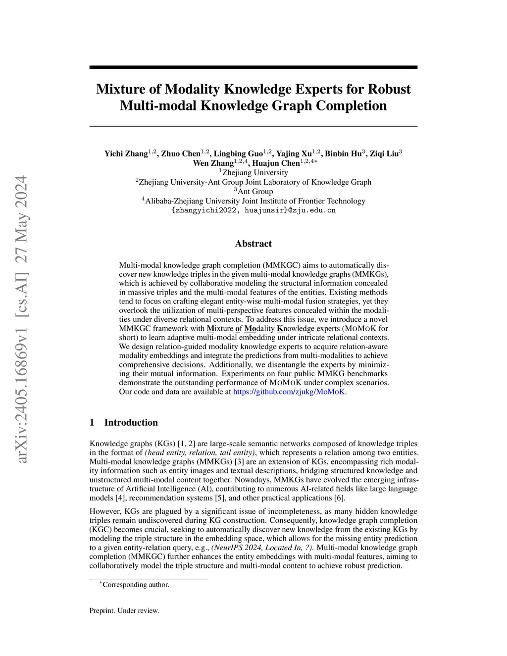 Learning high-quality multi-modal entity representations is an important goal of multi-modal knowledge graph (MMKG) representation learning, which can enhance reasoning tasks within the MMKGs, such as MMKG completion (MMKGC). The main challenge is to collaboratively model the structural information concealed in massive triples and the multi-modal features of the entities. Existing methods focus on crafting elegant entity-wise multi-modal fusion strategies, yet they overlook the utilization of multi-perspective features concealed within the modalities under diverse relational contexts. To address this issue, we introduce a novel framework with Mixture of Modality Knowledge experts (MoMoK for short) to learn adaptive multi-modal entity representations for better MMKGC. We design relation-guided modality knowledge experts to acquire relation-aware modality embeddings and integrate the predictions from multi-modalities to achieve joint decisions. Additionally, we disentangle the experts by minimizing their mutual information. Experiments on four public MMKG benchmarks demonstrate the outstanding performance of MoMoK under complex scenarios.