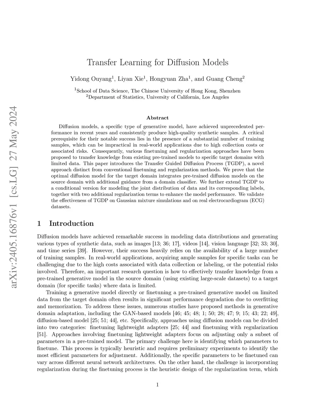 Diffusion models, a specific type of generative model, have achieved unprecedented performance in recent years and consistently produce high-quality synthetic samples. A critical prerequisite for their notable success lies in the presence of a substantial number of training samples, which can be impractical in real-world applications due to high collection costs or associated risks. Consequently, various finetuning and regularization approaches have been proposed to transfer knowledge from existing pre-trained models to specific target domains with limited data. This paper introduces the Transfer Guided Diffusion Process (TGDP), a novel approach distinct from conventional finetuning and regularization methods. We prove that the optimal diffusion model for the target domain integrates pre-trained diffusion models on the source domain with additional guidance from a domain classifier. We further extend TGDP to a conditional version for modeling the joint distribution of data and its corresponding labels, together with two additional regularization terms to enhance the model performance. We validate the effectiveness of TGDP on Gaussian mixture simulations and on real electrocardiogram (ECG) datasets.